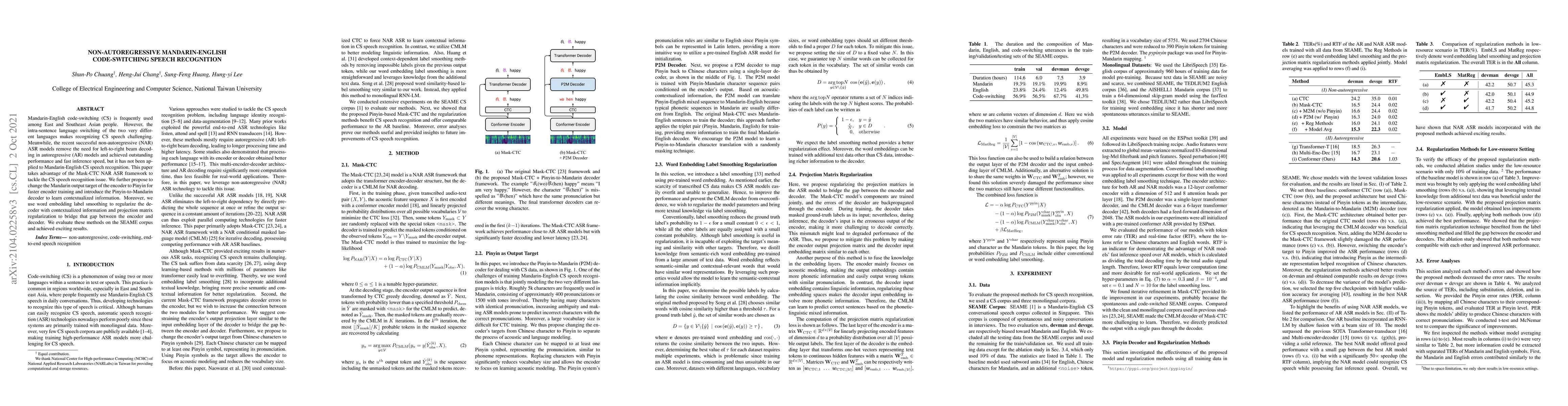 This research proposes a non-autoregressive (NAR) Mask-CTC ASR framework for Mandarin-English code-switching speech recognition, incorporating a Pinyin-to-Mandarin (P2M) decoder, word embedding label smoothing, and projection matrix regularization methods.