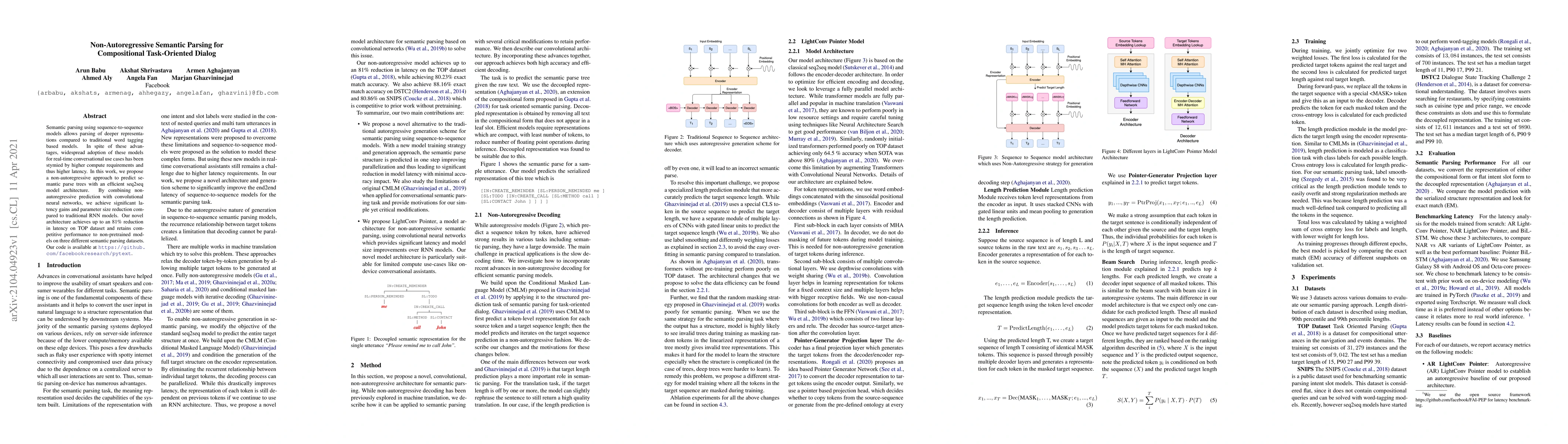 This paper proposes a non-autoregressive method for semantic parsing using an efficient seq2seq model architecture, achieving up to an 81% reduction in latency compared to traditional RNN models while maintaining competitive performance on multiple datasets. The approach leverages convolutional neural networks to reduce compute requirements and parameter size.