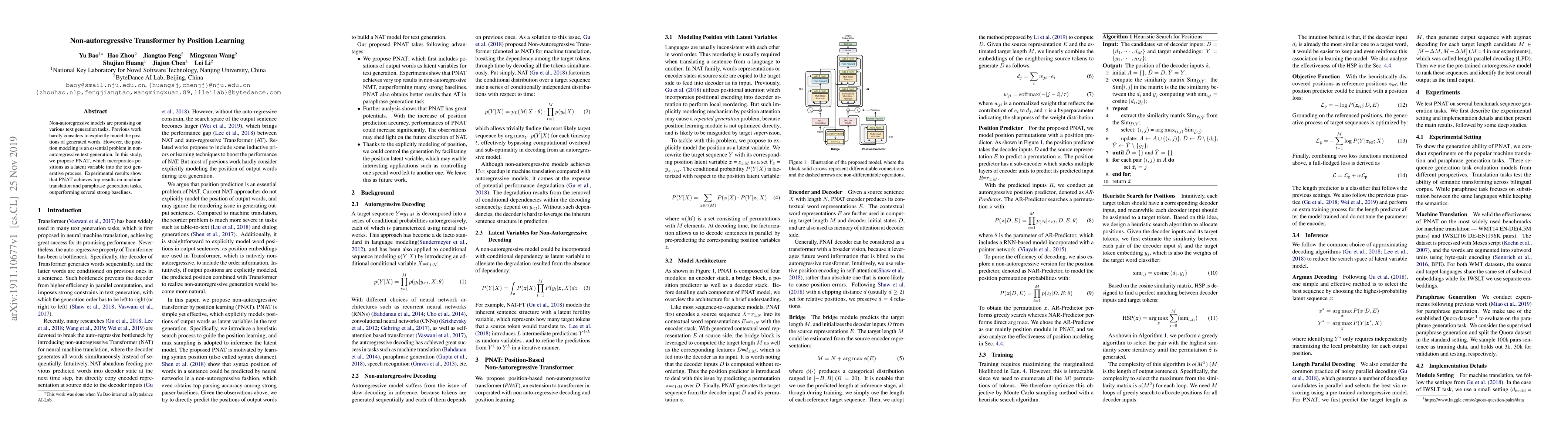 Non-autoregressive models are promising on various text generation tasks. Previous work hardly considers to explicitly model the positions of generated words. However, position modeling is an essential problem in non-autoregressive text generation. In this study, we propose PNAT, which incorporates positions as a latent variable into the text generative process. Experimental results show that PNAT achieves top results on machine translation and paraphrase generation tasks, outperforming several strong baselines.