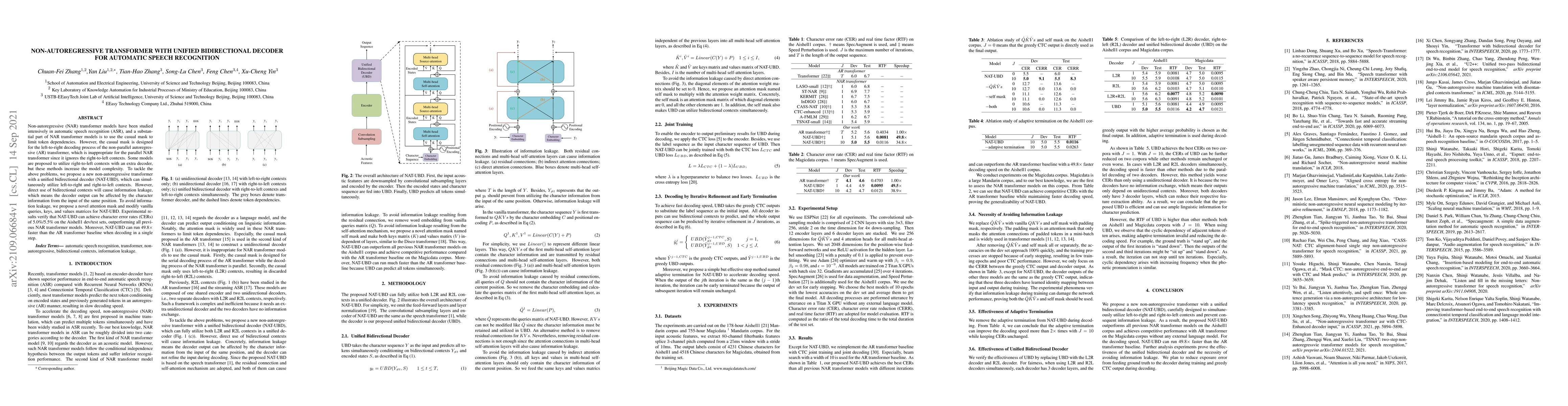 This paper proposes a Non-autoregressive Transformer with a Unified Bidirectional Decoder (NAT-UBD) for automatic speech recognition, addressing the limitations of casual masking in NAR models. The NAT-UBD utilizes both left-to-right and right-to-left contexts to improve performance while avoiding information leakage through a novel attention mask and modified matrices, achieving superior character error rates and significantly faster decoding speeds compared to autoregressive baselines.