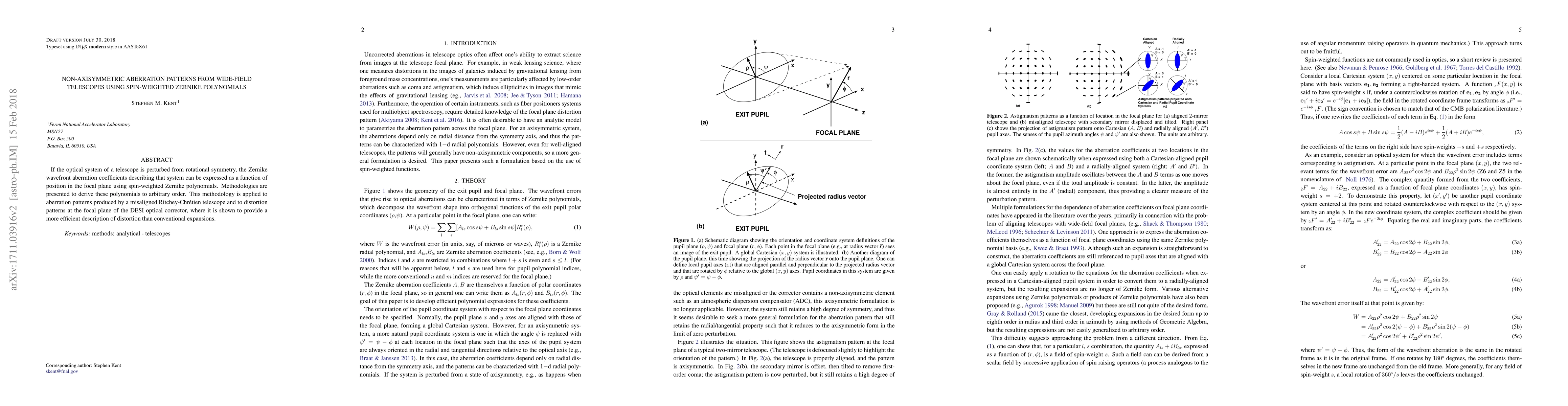 This paper introduces the use of spin-weighted Zernike polynomials to describe non-axisymmetric aberration patterns in wide-field telescopes, providing a more efficient method compared to conventional expansions, as demonstrated through applications to a misaligned Ritchey Chretian telescope and the DESI optical corrector.