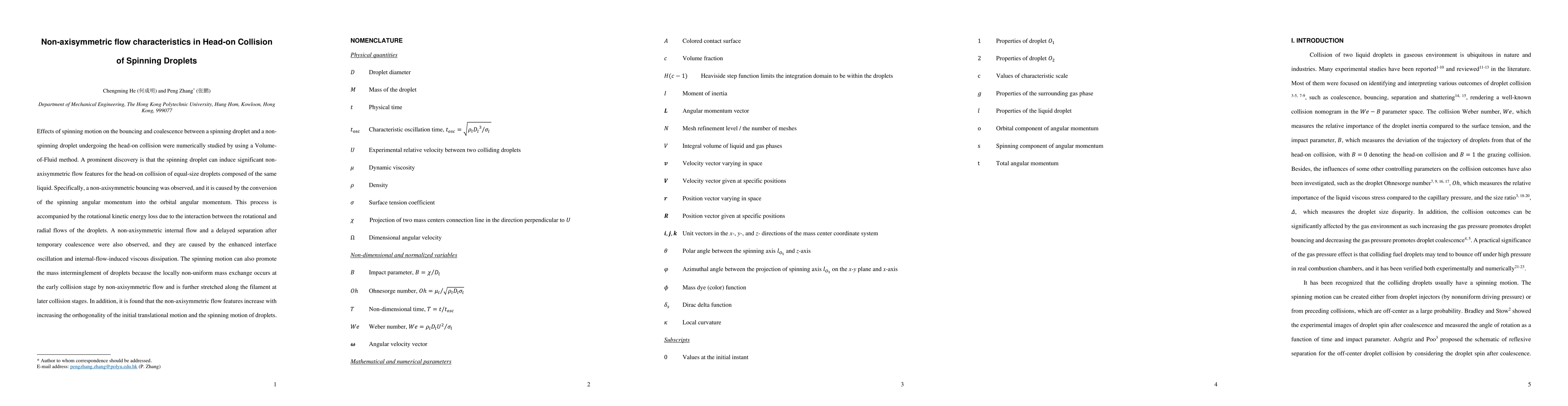 A study found that spinning droplets in a head-on collision exhibit non-axisymmetric flow characteristics, leading to bouncing, coalescence, and mass interminglement of the droplets. The spinning motion enhances interface oscillation and internal-flow-induced viscous dissipation.