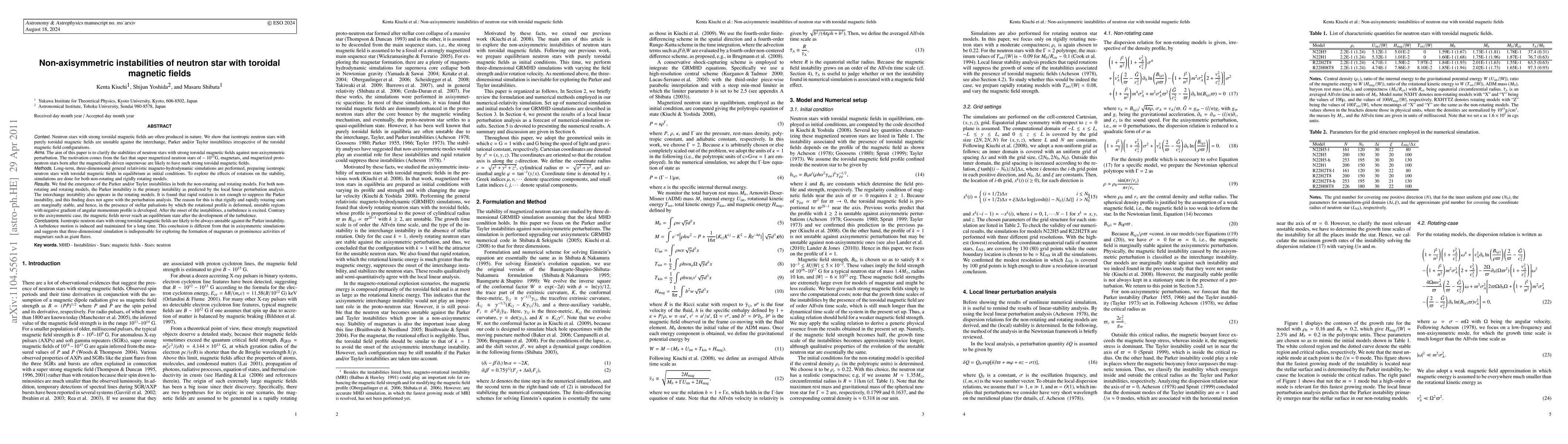 This paper investigates the stabilities of neutron stars with strong toroidal magnetic fields against non-axisymmetric perturbations, finding the emergence of Parker and Tayler instabilities in both non-rotating and rotating models. Rapid rotation does not suppress the Parker instability, leading to turbulence and preventing magnetic field equilibrium, suggesting the necessity of three-dimensional simulations for understanding magnetar phenomena.