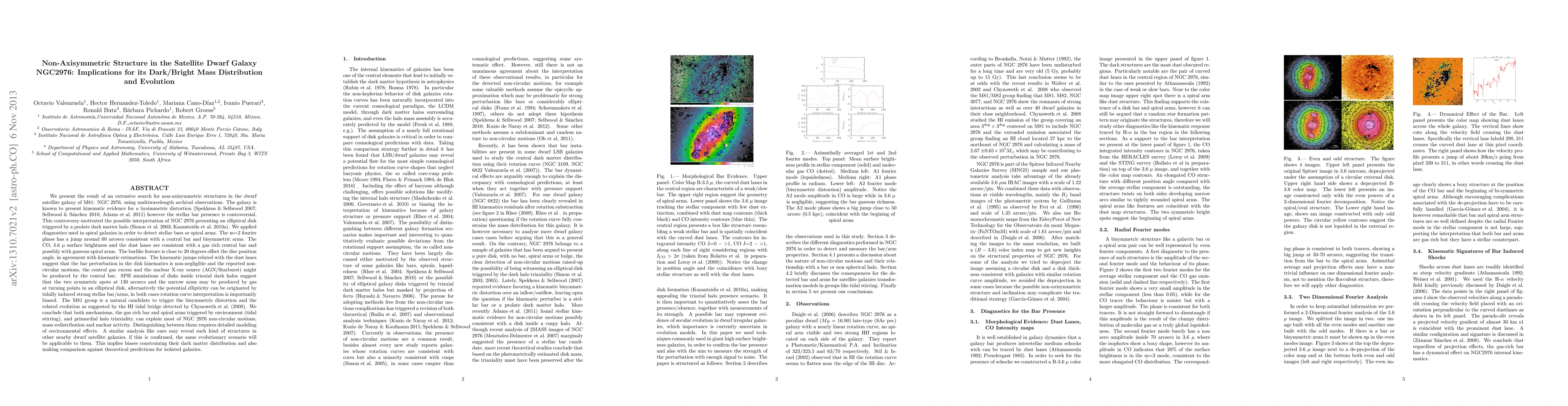 We present the result of an extensive search for non-axisymmetric structures in the dwarf satellite galaxy of M81: NGC 2976, using multiwavelength archival observations. The galaxy is known to present kinematic evidence for a bysimmetric distortion, anyhow the stellar bar presence is controversial, due to the possible interpretation of NGC 2976 presenting an elliptical disk triggered by a prolate dark matter halo. We applied diagnostics in order to detect stellar bars or spiral arms. The m=2 fourier phase has a jump around 60 arcsecs consistent with a central bar and bisymmetric arms. The CO, 3.6 $\mu$ surface brightness and the dust lanes are consistent with a gas rich central bar and possibly with gaseous spiral arms. The kinematic jumps related with the dust lanes suggest that the bar perturbation in the disk kinematics is non-negligible and the reported non-circular motions, the central gas excess and the nuclear X-ray source (AGN/Starburst) might be produced by the central bar. SPH simulations of disks inside triaxial dark halos suggest that the two symmetric spots at 130 arcsecs and the narrow arms may be produced by gas at turning points in an elliptical disk, alternatively the potential ellipticity can be originated by tidally induced strong stellar bar/arms. We conclude that, the gas rich bar and spiral arms triggered by tidal stirring, and primordial halo triaxiality, can explain most of the non-circular motions, mass redistribution and nuclear activity. Distinguishing between them requires detailed modeling of environmental effects. An analysis similar to this may reveal such kind of structures in other nearby dwarf satellite galaxies, and if confirmed, the same evolutionary scenario will be applicable to them. This implies biases constraining their dark matter distribution and also making comparison against theoretical predictions for isolated galaxies.