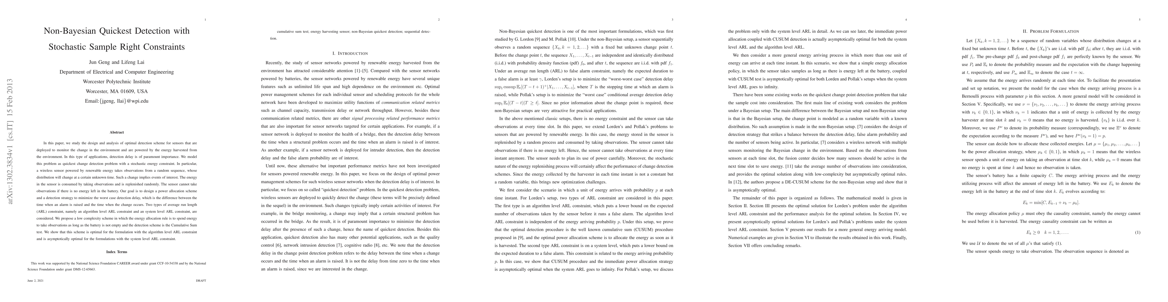 In this paper, we study the design and analysis of optimal detection scheme for sensors that are deployed to monitor the change in the environment and are powered by the energy harvested from the environment. In this type of applications, detection delay is of paramount importance. We model this problem as quickest change detection problem with a stochastic energy constraint. In particular, a wireless sensor powered by renewable energy takes observations from a random sequence, whose distribution will change at a certain unknown time. Such a change implies events of interest. The energy in the sensor is consumed by taking observations and is replenished randomly. The sensor cannot take observations if there is no energy left in the battery. Our goal is to design a power allocation scheme and a detection strategy to minimize the worst case detection delay, which is the difference between the time when an alarm is raised and the time when the change occurs. Two types of average run length (ARL) constraint, namely an algorithm level ARL constraint and an system level ARL constraint, are considered. We propose a low complexity scheme in which the energy allocation rule is to spend energy to take observations as long as the battery is not empty and the detection scheme is the Cumulative Sum test. We show that this scheme is optimal for the formulation with the algorithm level ARL constraint and is asymptotically optimal for the formulations with the system level ARL constraint.