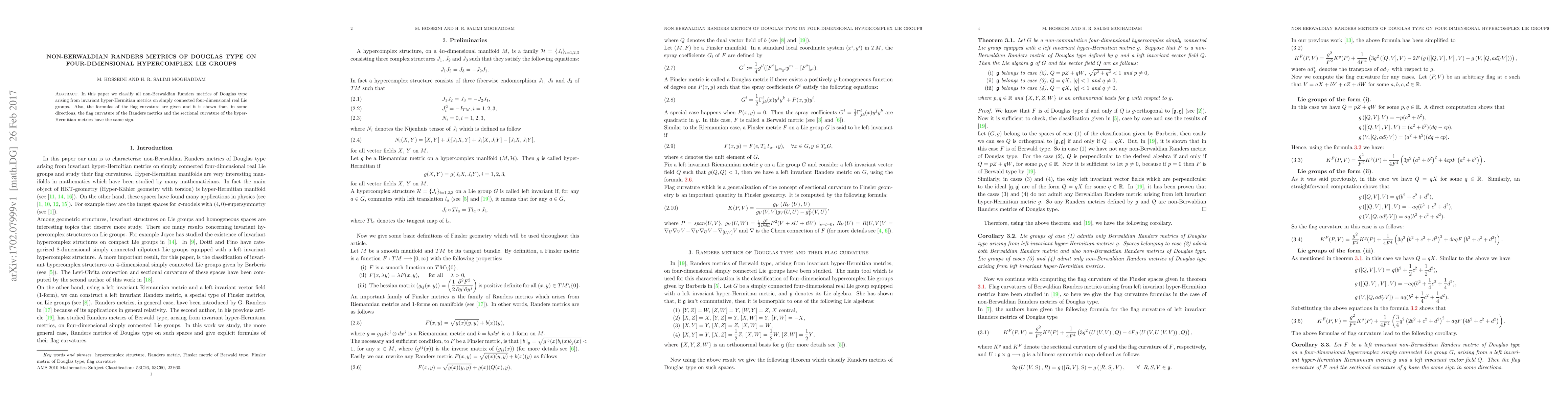 This paper classifies non-Berwaldian Randers metrics of Douglas type on four-dimensional hypercomplex Lie groups derived from invariant hyper-Hermitian metrics. It also provides formulas for the flag curvature and demonstrates that in certain directions, the flag curvature of the Randers metrics matches the sign of the sectional curvature of the hyper-Hermitian metrics.