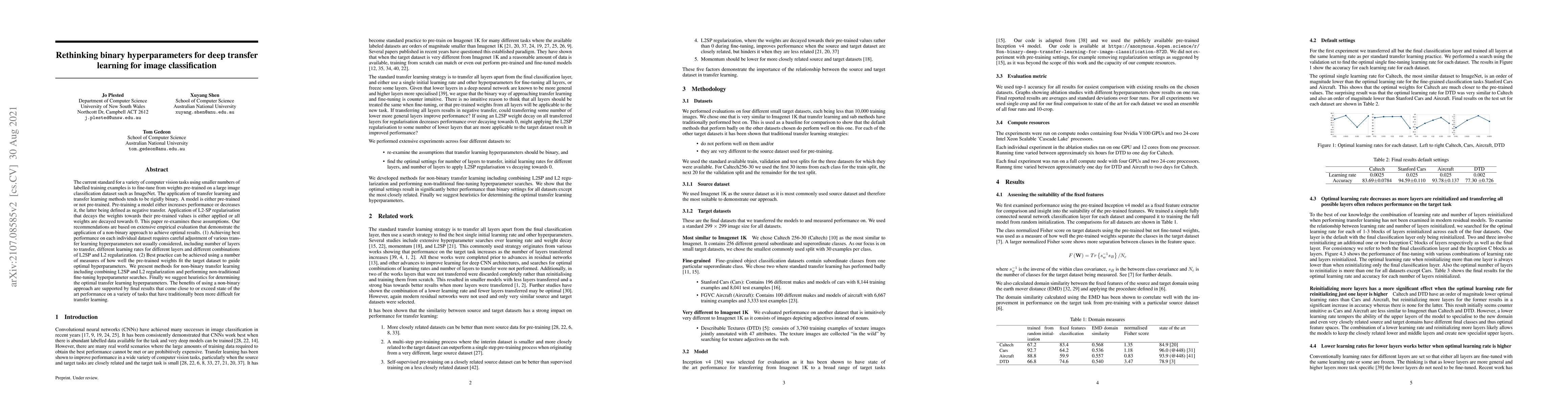 The current standard for a variety of computer vision tasks using smaller numbers of labelled training examples is to fine-tune from weights pre-trained on a large image classification dataset such as ImageNet. The application of transfer learning and transfer learning methods tends to be rigidly binary. A model is either pre-trained or not pre-trained. Pre-training a model either increases performance or decreases it, the latter being defined as negative transfer. Application of L2-SP regularisation that decays the weights towards their pre-trained values is either applied or all weights are decayed towards 0. This paper re-examines these assumptions. Our recommendations are based on extensive empirical evaluation that demonstrate the application of a non-binary approach to achieve optimal results. (1) Achieving best performance on each individual dataset requires careful adjustment of various transfer learning hyperparameters not usually considered, including number of layers to transfer, different learning rates for different layers and different combinations of L2SP and L2 regularization. (2) Best practice can be achieved using a number of measures of how well the pre-trained weights fit the target dataset to guide optimal hyperparameters. We present methods for non-binary transfer learning including combining L2SP and L2 regularization and performing non-traditional fine-tuning hyperparameter searches. Finally we suggest heuristics for determining the optimal transfer learning hyperparameters. The benefits of using a non-binary approach are supported by final results that come close to or exceed state of the art performance on a variety of tasks that have traditionally been more difficult for transfer learning.