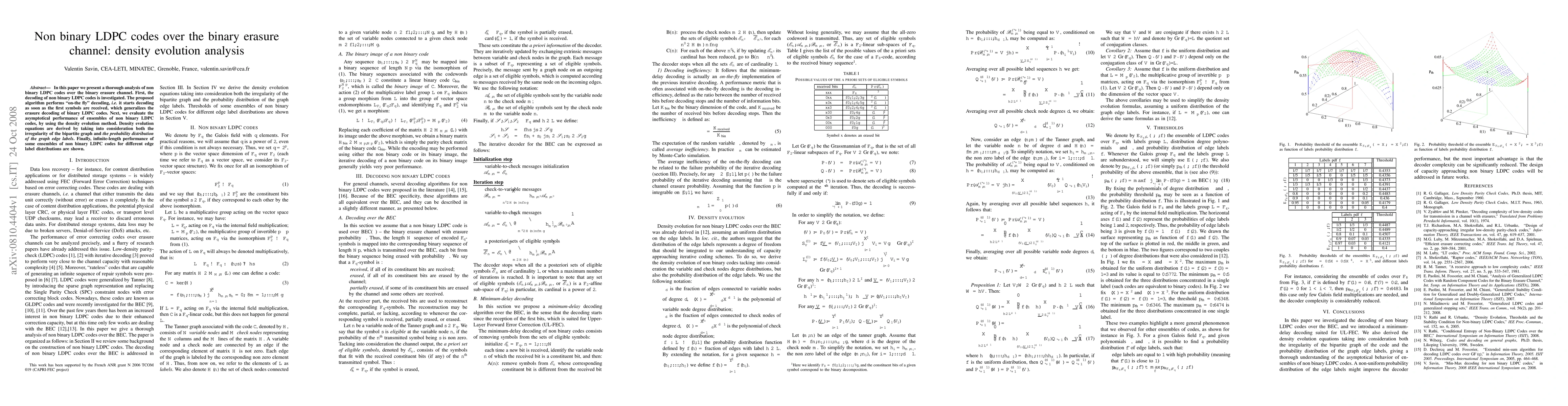 In this paper we present a thorough analysis of non binary LDPC codes over the binary erasure channel. First, the decoding of non binary LDPC codes is investigated. The proposed algorithm performs on-the-fly decoding, i.e. it starts decoding as soon as the first symbols are received, which generalizes the erasure decoding of binary LDPC codes. Next, we evaluate the asymptotical performance of ensembles of non binary LDPC codes, by using the density evolution method. Density evolution equations are derived by taking into consideration both the irregularity of the bipartite graph and the probability distribution of the graph edge labels. Finally, infinite-length performance of some ensembles of non binary LDPC codes for different edge label distributions are shown.