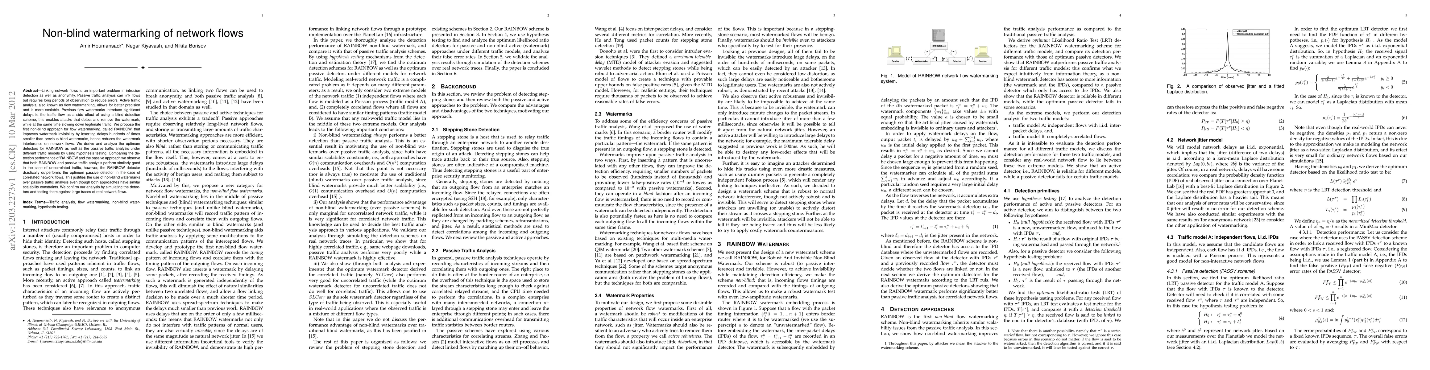 Linking network flows is an important problem in intrusion detection as well as anonymity. Passive traffic analysis can link flows but requires long periods of observation to reduce errors. Active traffic analysis, also known as flow watermarking, allows for better precision and is more scalable. Previous flow watermarks introduce significant delays to the traffic flow as a side effect of using a blind detection scheme; this enables attacks that detect and remove the watermark, while at the same time slowing down legitimate traffic. We propose the first non-blind approach for flow watermarking, called RAINBOW, that improves watermark invisibility by inserting delays hundreds of times smaller than previous blind watermarks, hence reduces the watermark interference on network flows. We derive and analyze the optimum detectors for RAINBOW as well as the passive traffic analysis under different traffic models by using hypothesis testing. Comparing the detection performance of RAINBOW and the passive approach we observe that both RAINBOW and passive traffic analysis perform similarly good in the case of uncorrelated traffic, however, the RAINBOW detector drastically outperforms the optimum passive detector in the case of correlated network flows. This justifies the use of non-blind watermarks over passive traffic analysis even though both approaches have similar scalability constraints. We confirm our analysis by simulating the detectors and testing them against large traces of real network flows.