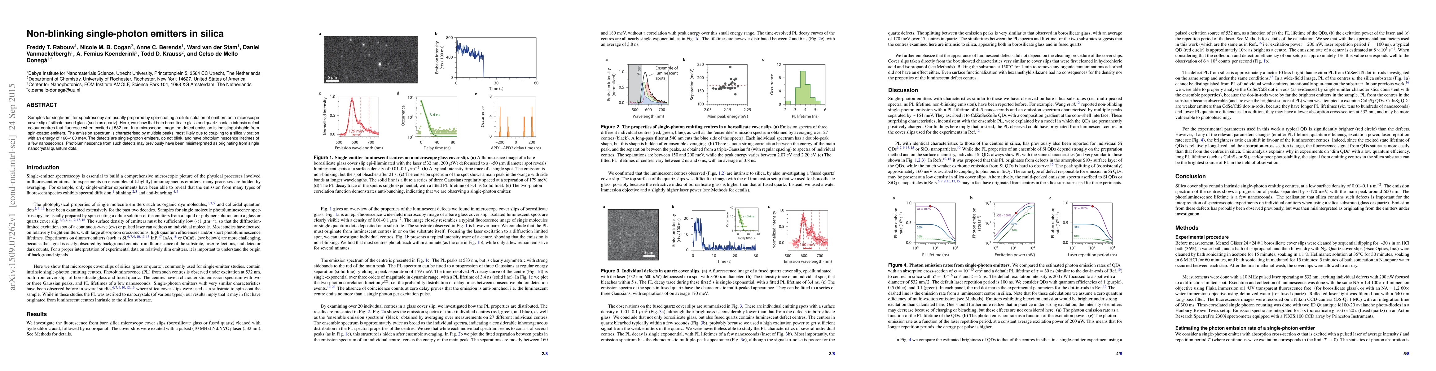 Samples for single-emitter spectroscopy are usually prepared by spin-coating a dilute solution of emitters on a microscope cover slip of silicate based glass (such as quartz). Here, we show that both borosilicate glass and quartz contain intrinsic defect colour centres that fluoresce when excited at 532 nm. In a microscope image the defect emission is indistinguishable from spin-coated emitters. The emission spectrum is characterised by multiple peaks, most likely due to coupling to a silica vibration with an energy of 160-180 meV. The defects are single-photon emitters, do not blink, and have photoluminescence lifetimes of a few nanoseconds. Photoluminescence from such defects may previously have been misinterpreted as originating from single nanocrystal quantum dots.