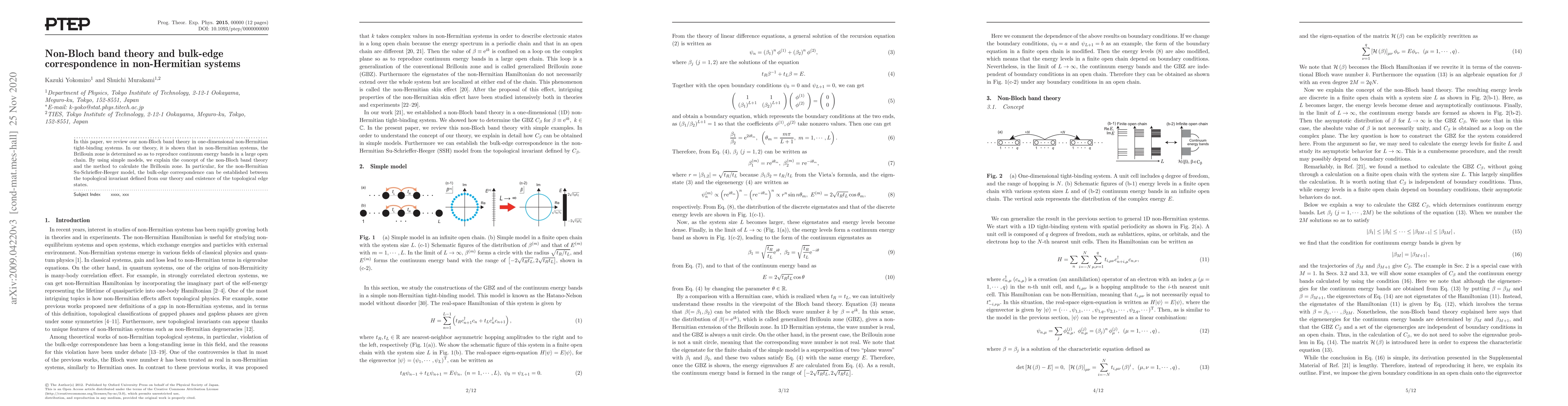 This paper reviews non-Bloch band theory in one-dimensional non-Hermitian systems, demonstrating how the Brillouin zone is defined to match continuum energy bands. It establishes the bulk-edge correspondence in the non-Hermitian Su-Schrieffer-Heeger model, linking topological invariants to the presence of topological edge states.