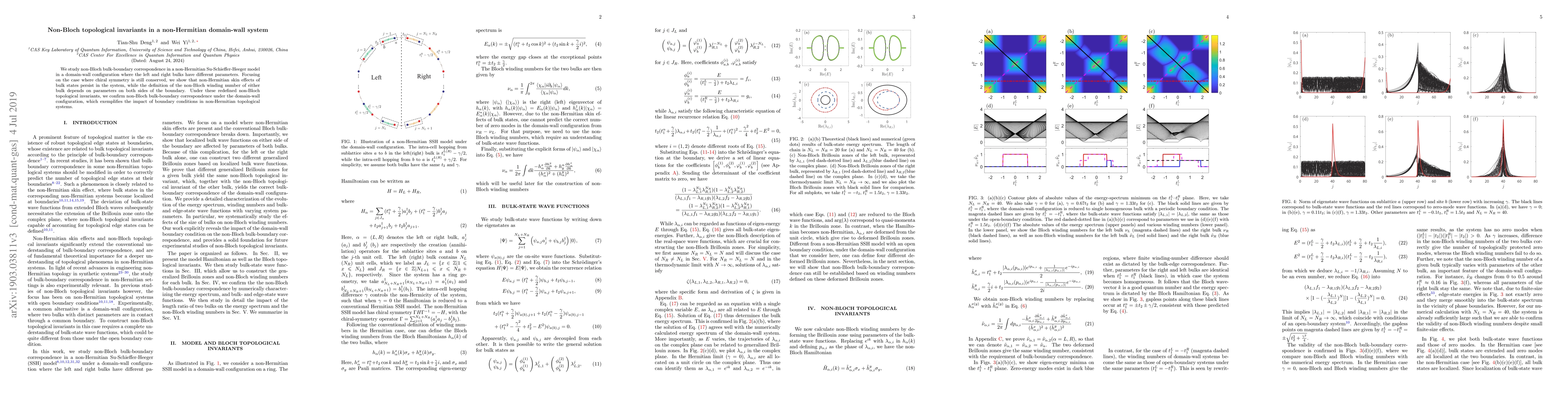 This paper investigates non-Bloch topological invariants in a non-Hermitian Su-Schiffer-Heeger model, demonstrating that non-Hermitian skin effects persist in domain-wall configurations despite differing bulk parameters. It redefines non-Bloch winding numbers for each bulk and confirms non-Bloch bulk-boundary correspondence, highlighting the influence of boundary conditions in non-Hermitian topological systems.