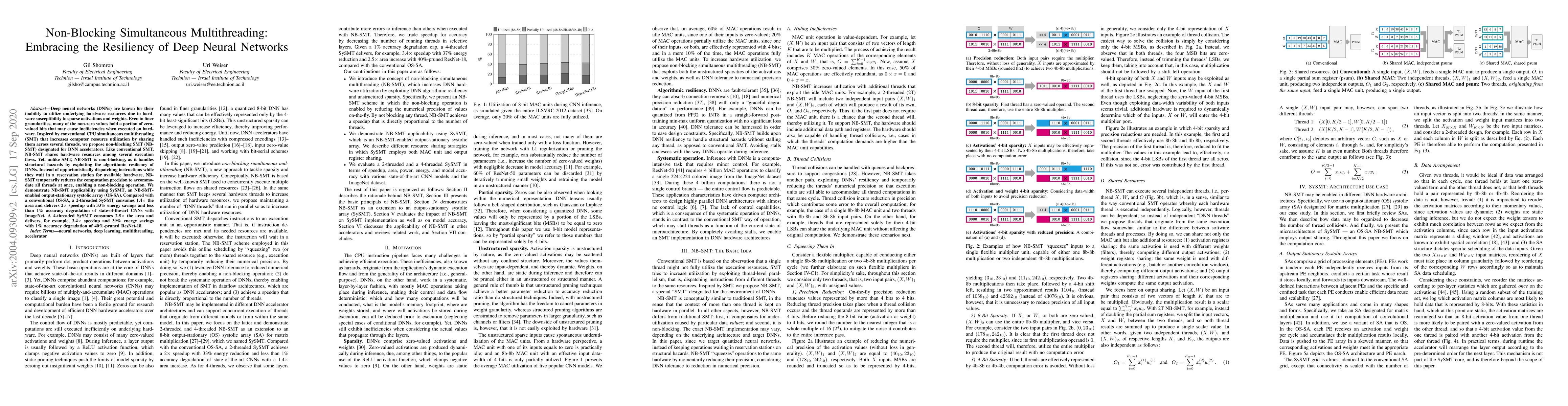 Deep neural networks (DNNs) are known for their inability to utilize underlying hardware resources due to hardware susceptibility to sparse activations and weights. Even in finer granularities, many of the non-zero values hold a portion of zero-valued bits that may cause inefficiencies when executed on hardware. Inspired by conventional CPU simultaneous multithreading (SMT) that increases computer resource utilization by sharing them across several threads, we propose non-blocking SMT (NB-SMT) designated for DNN accelerators. Like conventional SMT, NB-SMT shares hardware resources among several execution flows. Yet, unlike SMT, NB-SMT is non-blocking, as it handles structural hazards by exploiting the algorithmic resiliency of DNNs. Instead of opportunistically dispatching instructions while they wait in a reservation station for available hardware, NB-SMT temporarily reduces the computation precision to accommodate all threads at once, enabling a non-blocking operation. We demonstrate NB-SMT applicability using SySMT, an NB-SMT-enabled output-stationary systolic array (OS-SA). Compared with a conventional OS-SA, a 2-threaded SySMT consumes 1.4x the area and delivers 2x speedup with 33% energy savings and less than 1% accuracy degradation of state-of-the-art CNNs with ImageNet. A 4-threaded SySMT consumes 2.5x the area and delivers, for example, 3.4x speedup and 39% energy savings with 1% accuracy degradation of 40%-pruned ResNet-18.