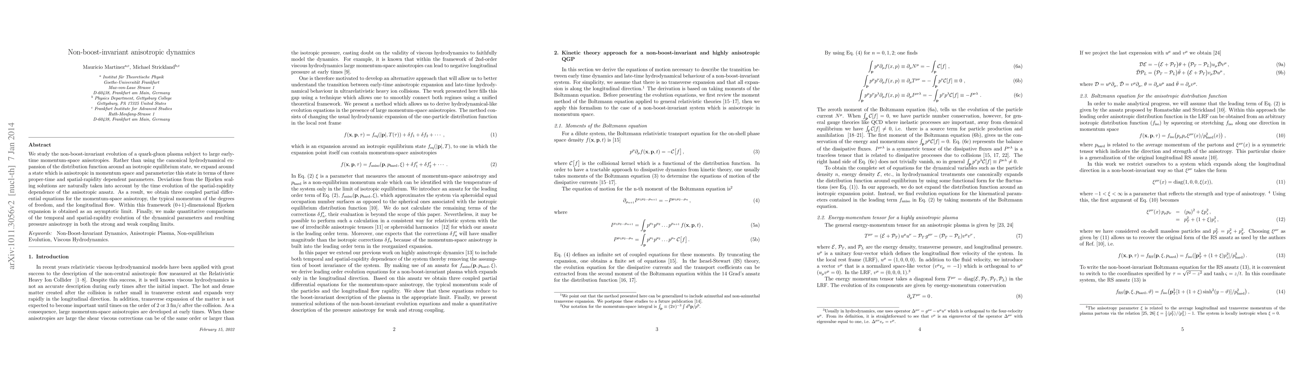 This paper explores the non-boost-invariant evolution of quark-gluon plasma with significant early-time momentum anisotropy, expanding the distribution function around an anisotropic state rather than an isotropic one. The study derives three coupled partial differential equations to describe the anisotropy, typical momentum, and longitudinal flow, and compares results in strong and weak coupling regimes.