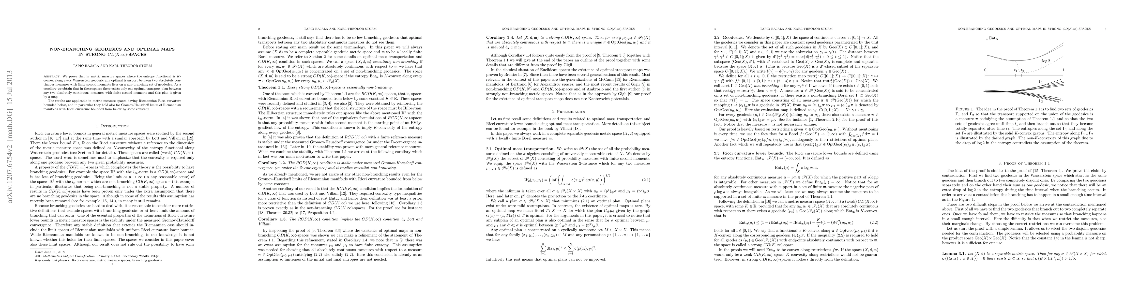 This paper proves that in strong CD(K,∞)-spaces, optimal transport between measures with finite second moments follows a single, non-branching geodesic. This implies the uniqueness of optimal transport plans in such spaces.