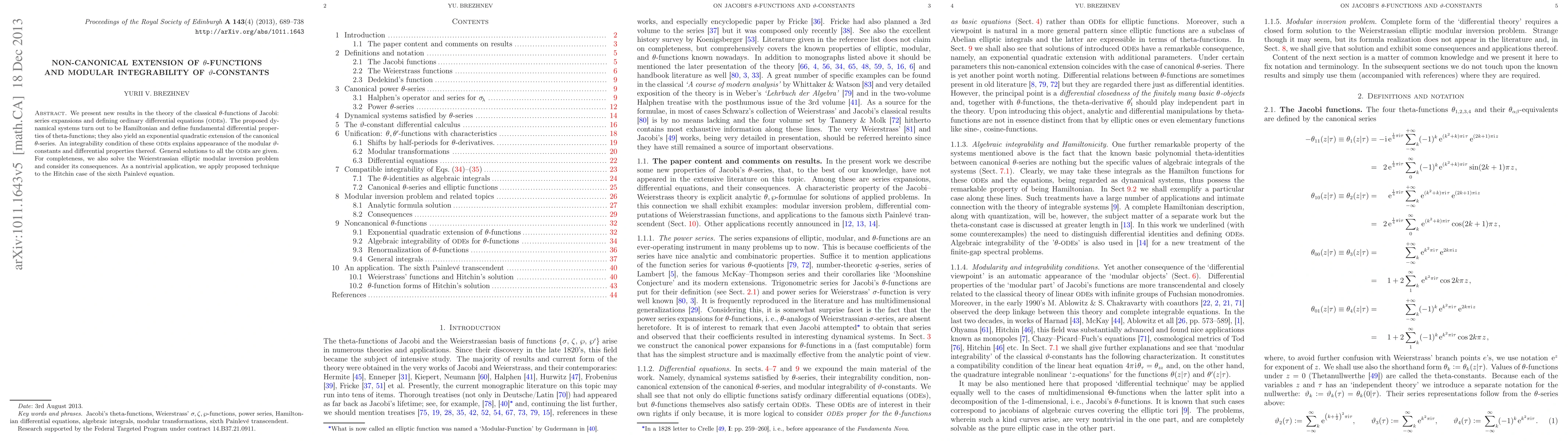 This is an extended (factor 2.5) version of arXiv:math/0601371 and arXiv:0808.3486. We present new results in the theory of the classical $\theta$-functions of Jacobi: series expansions and defining ordinary differential equations (\odes). The proposed dynamical systems turn out to be Hamiltonian and define fundamental differential properties of theta-functions; they also yield an exponential quadratic extension of the canonical $\theta$-series. An integrability condition of these \odes\ explains appearance of the modular $\vartheta$-constants and differential properties thereof. General solutions to all the \odes\ are given. For completeness, we also solve the Weierstrassian elliptic modular inversion problem and consider its consequences. As a nontrivial application, we apply proposed techni\-que to the Hitchin case of the sixth Painlev\'e equation.