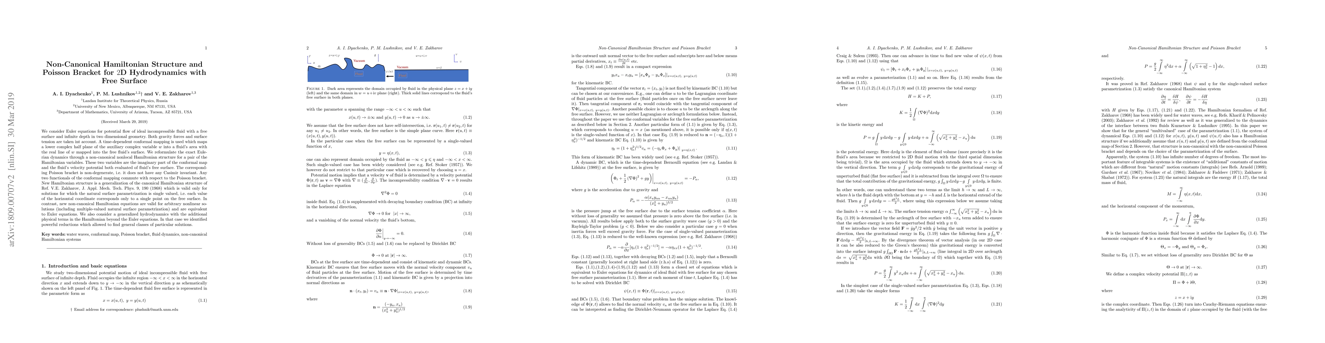 We consider Euler equations for potential flow of ideal incompressible fluid with a free surface and infinite depth in two dimensional geometry. Both gravity forces and surface tension are taken int account. A time-dependent conformal mapping is used which maps a lower complex half plane of the auxiliary complex variable $w$ into a fluid's area with the real line of $w$ mapped into the free fluid's surface. We reformulate the exact Eulerian dynamics through a non-canonical nonlocal Hamiltonian structure for a pair of the Hamiltonian variables. These two variables are the imaginary part of the conformal map and the fluid's velocity potential both evaluated of fluid's free surface. The corresponding Poisson bracket is non-degenerate, i.e. it does not have any Casimir invariant. Any two functionals of the conformal mapping commute with respect to the Poisson bracket. New Hamiltonian structure is a generalization of the canonical Hamiltonian structure of Ref. V.E. Zakharov, J. Appl. Mech. Tech. Phys. 9, 190 (1968) which is valid only for solutions for which the natural surface parametrization is single valued, i.e. each value of the horizontal coordinate corresponds only to a single point on the free surface. In contrast, new non-canonical Hamiltonian equations are valid for arbitrary nonlinear solutions (including multiple-valued natural surface parametrization) and are equivalent to Euler equations. We also consider a generalized hydrodynamics with the additional physical terms in the Hamiltonian beyond the Euler equations. In that case we identified powerful reductions which allowed to find general classes of particular solutions.