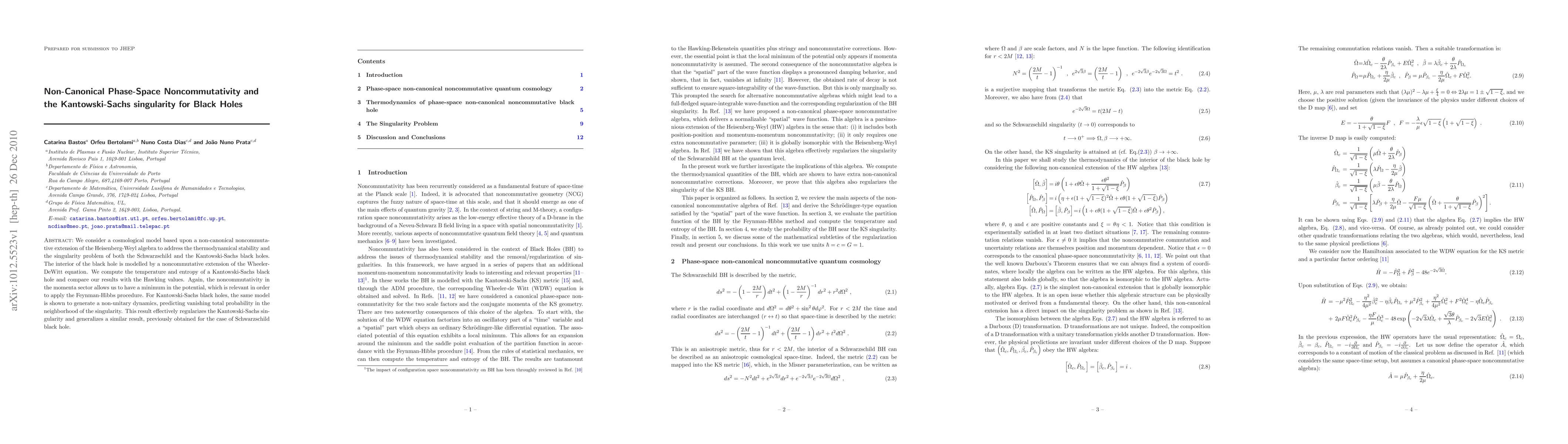 We consider a cosmological model based upon a non-canonical noncommutative extension of the Heisenberg-Weyl algebra to address the thermodynamical stability and the singularity problem of both the Schwarzschild and the Kantowski-Sachs black holes. The interior of the black hole is modelled by a noncommutative extension of the Wheeler-DeWitt equation. We compute the temperature and entropy of a Kantowski-Sachs black hole and compare our results with the Hawking values. Again, the noncommutativity in the momenta sector allows us to have a minimum in the potential, which is relevant in order to apply the Feynman-Hibbs procedure. For Kantowski-Sachs black holes, the same model is shown to generate a non-unitary dynamics, predicting vanishing total probability in the neighborhood of the singularity. This result effectively regularizes the Kantowski-Sachs singularity and generalizes a similar result, previously obtained for the case of Schwarzschild black hole.