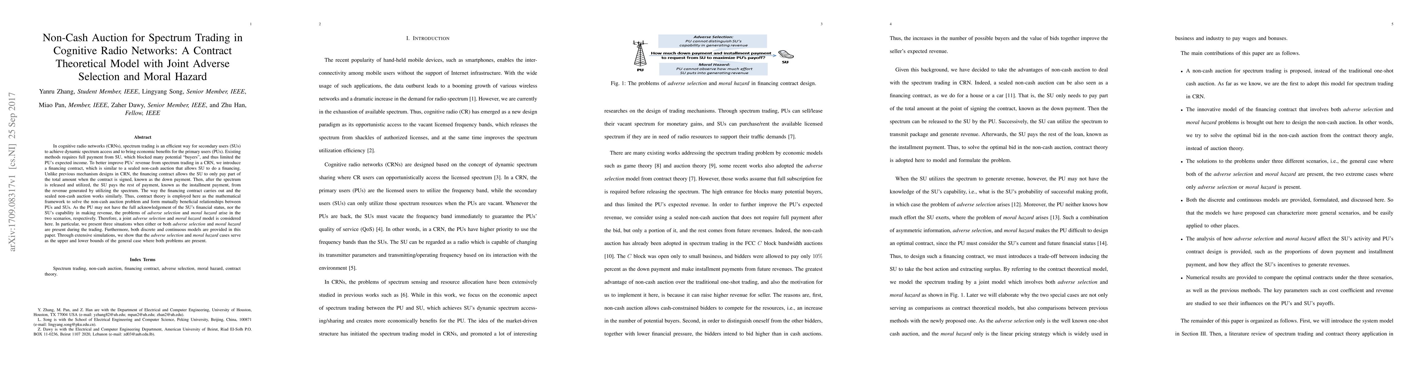 In cognitive radio networks (CRNs), spectrum trading is an efficient way for secondary users (SUs) to achieve dynamic spectrum access and to bring economic benefits for the primary users (PUs). Existing methods requires full payment from SU, which blocked many potential "buyers", and thus limited the PU's expected income. To better improve PUs' revenue from spectrum trading in a CRN, we introduce a financing contract, which is similar to a sealed non-cash auction that allows SU to do a financing. Unlike previous mechanism designs in CRN, the financing contract allows the SU to only pay part of the total amount when the contract is signed, known as the down payment. Then, after the spectrum is released and utilized, the SU pays the rest of payment, known as the installment payment, from the revenue generated by utilizing the spectrum. The way the financing contract carries out and the sealed non-cash auction works similarly. Thus, contract theory is employed here as the mathematical framework to solve the non-cash auction problem and form mutually beneficial relationships between PUs and SUs. As the PU may not have the full acknowledgement of the SU's financial status, nor the SU's capability in making revenue, the problems of adverse selection and moral hazard arise in the two scenarios, respectively. Therefore, a joint adverse selection and moral hazard model is considered here. In particular, we present three situations when either or both adverse selection and moral hazard are present during the trading. Furthermore, both discrete and continuous models are provided in this paper. Through extensive simulations, we show that the adverse selection and moral hazard cases serve as the upper and lower bounds of the general case where both problems are present.