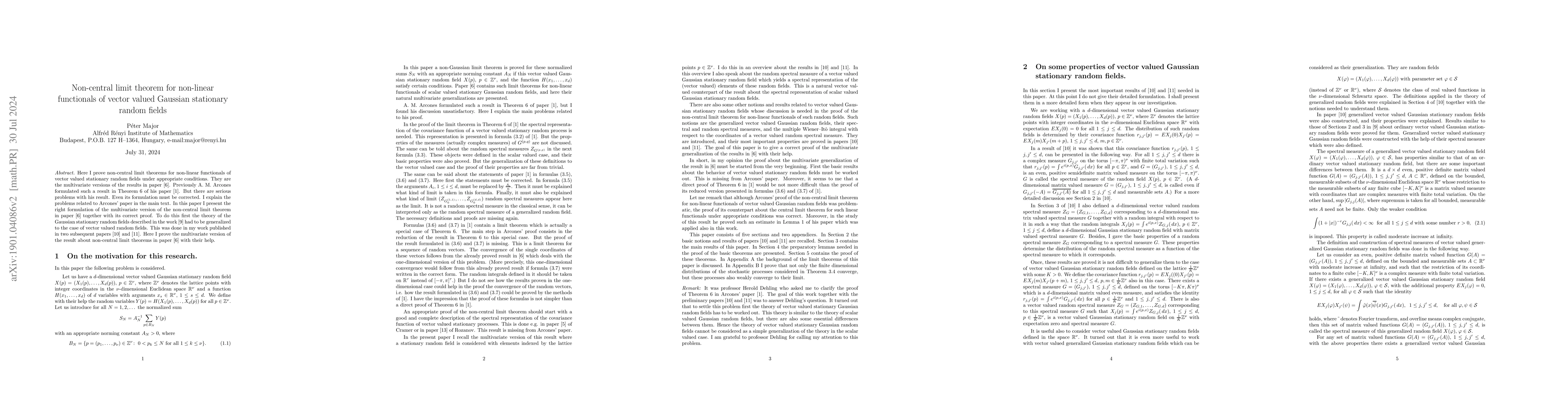This paper proves non-central limit theorems for non-linear functionals of vector-valued Gaussian stationary random fields, extending results from a univariate context. The author addresses perceived incompleteness in previous multivariate generalizations by establishing a more profound foundation for the theory in a related work.