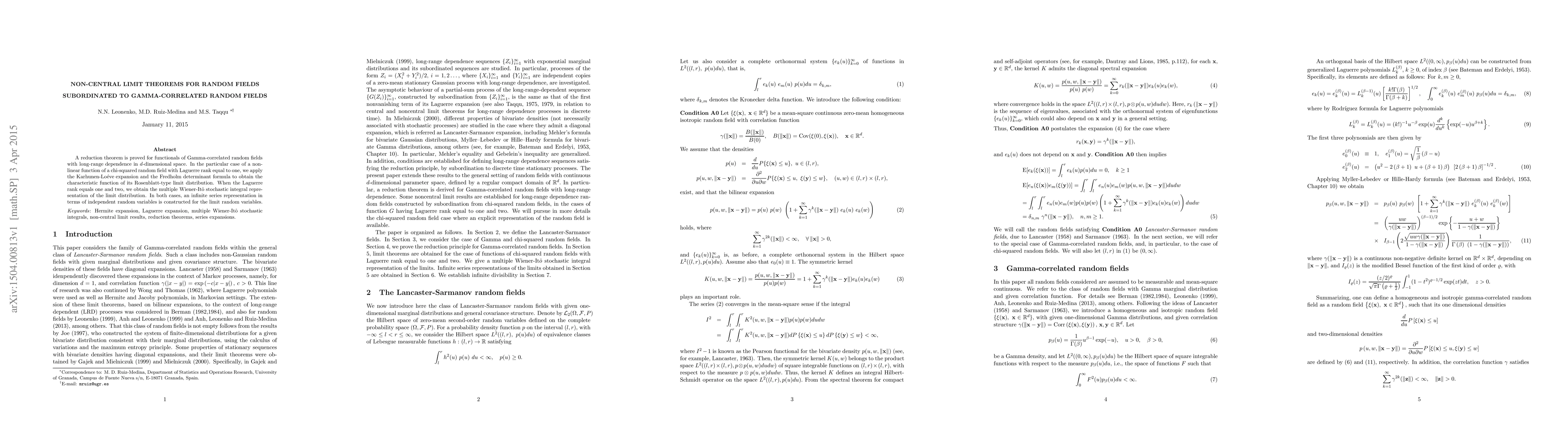 A reduction theorem is proved for functionals of Gamma-correlated random fields with long-range dependence in d-dimensional space. In the particular case of a non-linear function of a chi-squared random field with Laguerre rank equal to one, we apply the Karhunen-Lo\'eve expansion and the Fredholm determinant formula to obtain the characteristic function of its Rosenblatt-type limit distribution. When the Laguerre rank equals one and two, we obtain the multiple Wiener-It\^o stochastic integral representation of the limit distribution. In both cases, an infinite series representation in terms of independent random variables is constructed for the limit random variables.