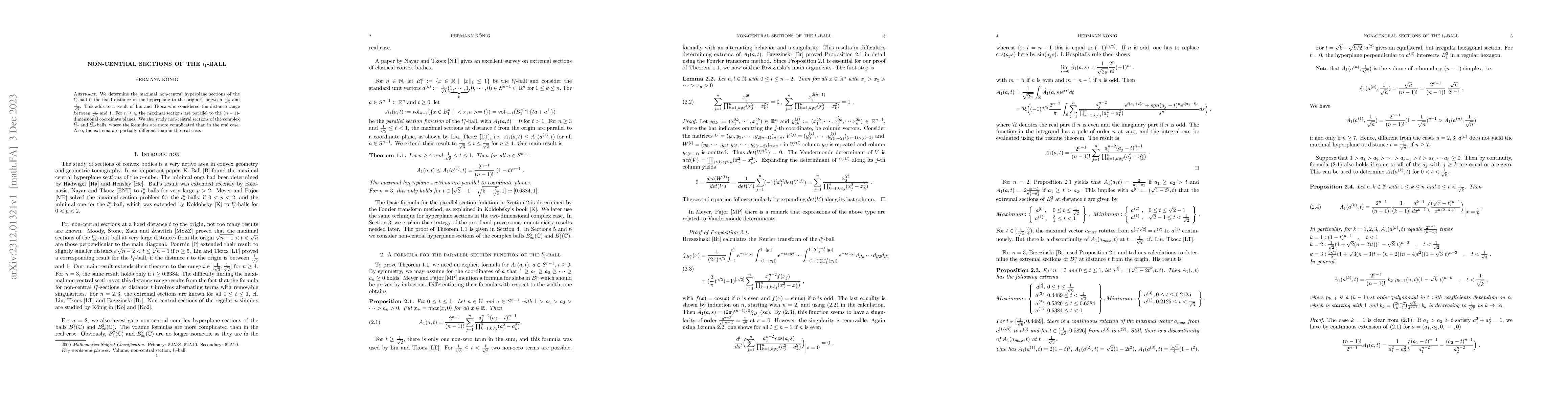 This paper investigates maximal non-central hyperplane sections of the n-dimensional $l_1$-ball for distances between $1 / \sqrt 3$ and $1 / \sqrt 2$. For $n > 3$, these sections are parallel to the $(n-1)$-dimensional coordinate planes, extending previous results by Liu and Tkocz. It also examines non-central sections of the complex $l_1^2$- and $l_\infty^2$-balls, revealing more complex formulas and different extrema compared to the real case.