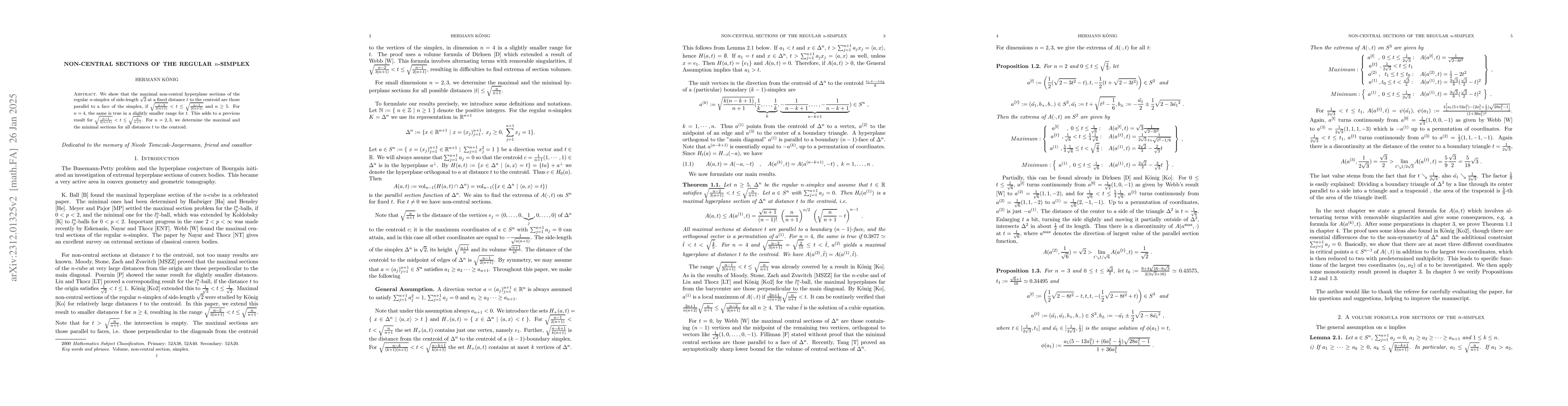 The paper presents a comprehensive analysis of the conditions under which non-central sections of the regular n-simplex are maximal, extending previous results for n > 4 and providing detailed solutions for n = 2, 3, and 4.