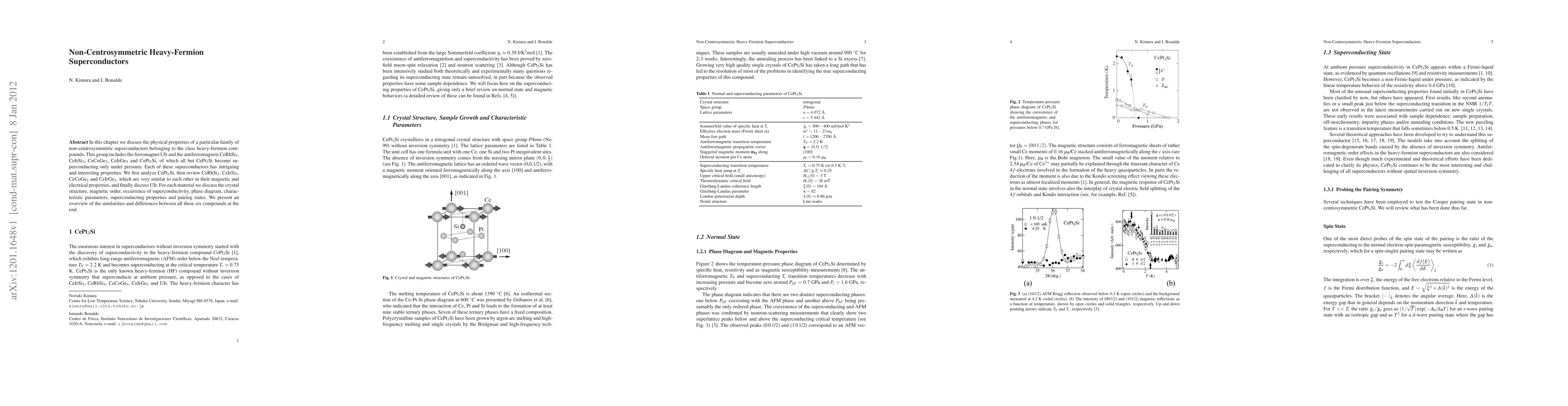 This paper explores the physical properties of non-centrosymmetric heavy-fermion superconductors, focusing on ferromagnet UIr and antiferromagnets CeRhSi3, CeIrSi3, CeCoGe3, CeIrGe3, and CePt3Si. It analyzes each compound's crystal structure, magnetic order, superconductivity, and pairing states, concluding with an overview of their similarities and differences.