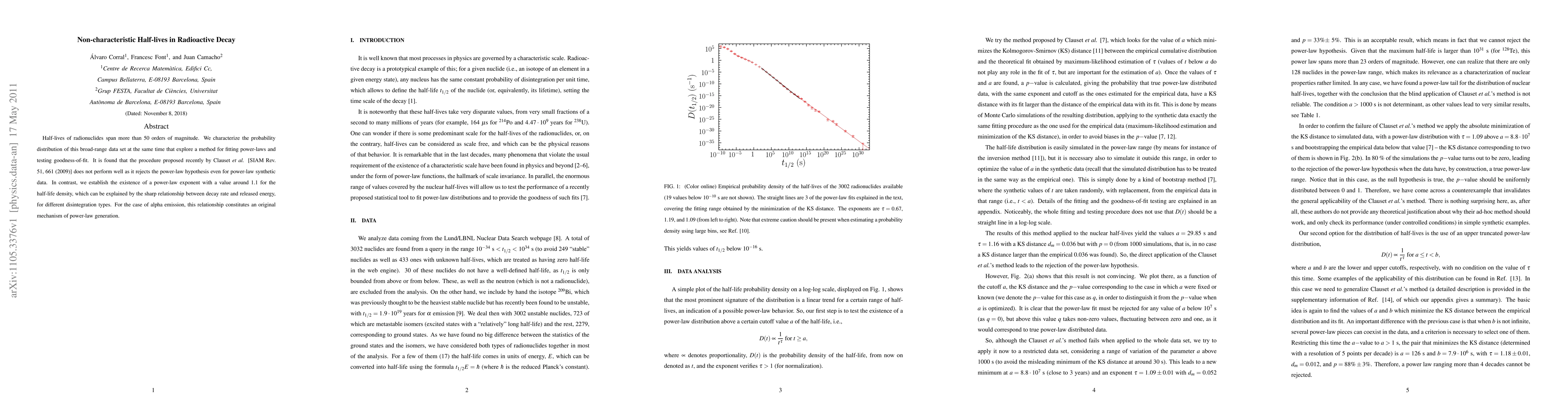 Half-lives of radionuclides span more than 50 orders of magnitude. We characterize the probability distribution of this broad-range data set at the same time that explore a method for fitting power-laws and testing goodness-of-fit. It is found that the procedure proposed recently by Clauset et al. [SIAM Rev. 51, 661 (2009)] does not perform well as it rejects the power-law hypothesis even for power-law synthetic data. In contrast, we establish the existence of a power-law exponent with a value around 1.1 for the half-life density, which can be explained by the sharp relationship between decay rate and released energy, for different disintegration types. For the case of alpha emission, this relationship constitutes an original mechanism of power-law generation.