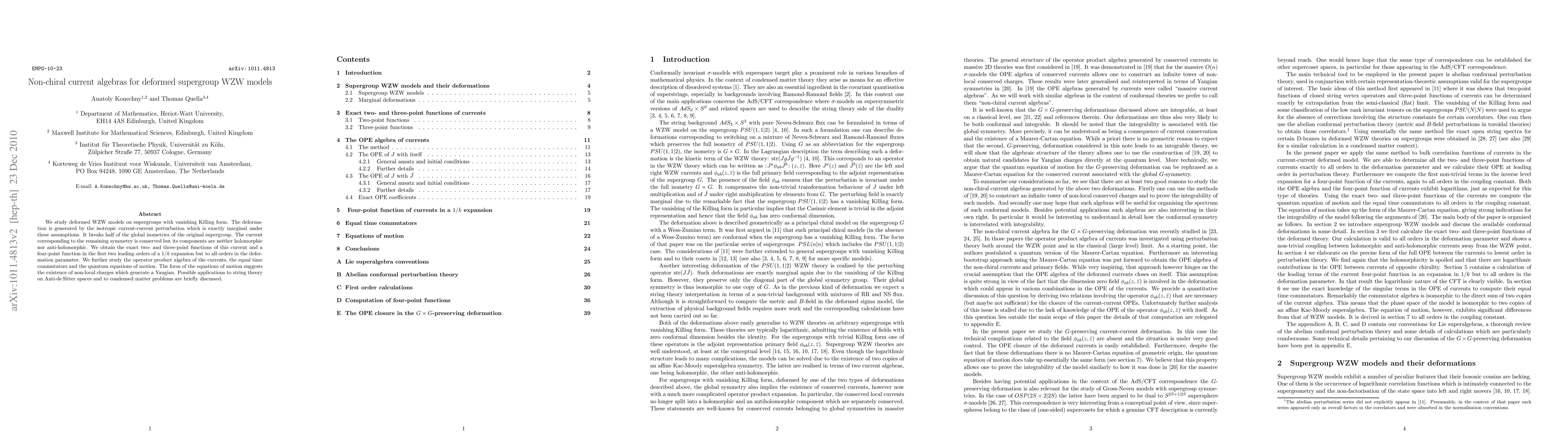 We study deformed WZW models on supergroups with vanishing Killing form. The deformation is generated by the isotropic current-current perturbation which is exactly marginal under these assumptions. It breaks half of the global isometries of the original supergroup. The current corresponding to the remaining symmetry is conserved but its components are neither holomorphic nor anti-holomorphic. We obtain the exact two- and three-point functions of this current and a four-point function in the first two leading orders of a 1/k expansion but to all orders in the deformation parameter. We further study the operator product algebra of the currents, the equal time commutators and the quantum equations of motion. The form of the equations of motion suggests the existence of non-local charges which generate a Yangian. Possible applications to string theory on Anti-de Sitter spaces and to condensed matter problems are briefly discussed.