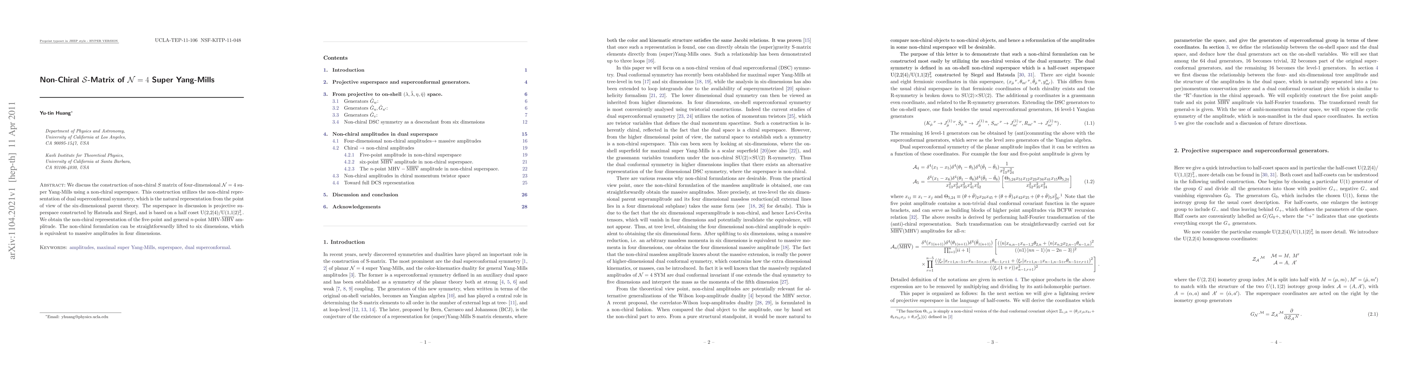 This paper constructs a non-chiral S-matrix for four-dimensional N=4 super Yang-Mills using a non-chiral superspace representation and dual superconformal symmetry. The resulting formulation is extended to six dimensions, equating to massive amplitudes in four dimensions.
