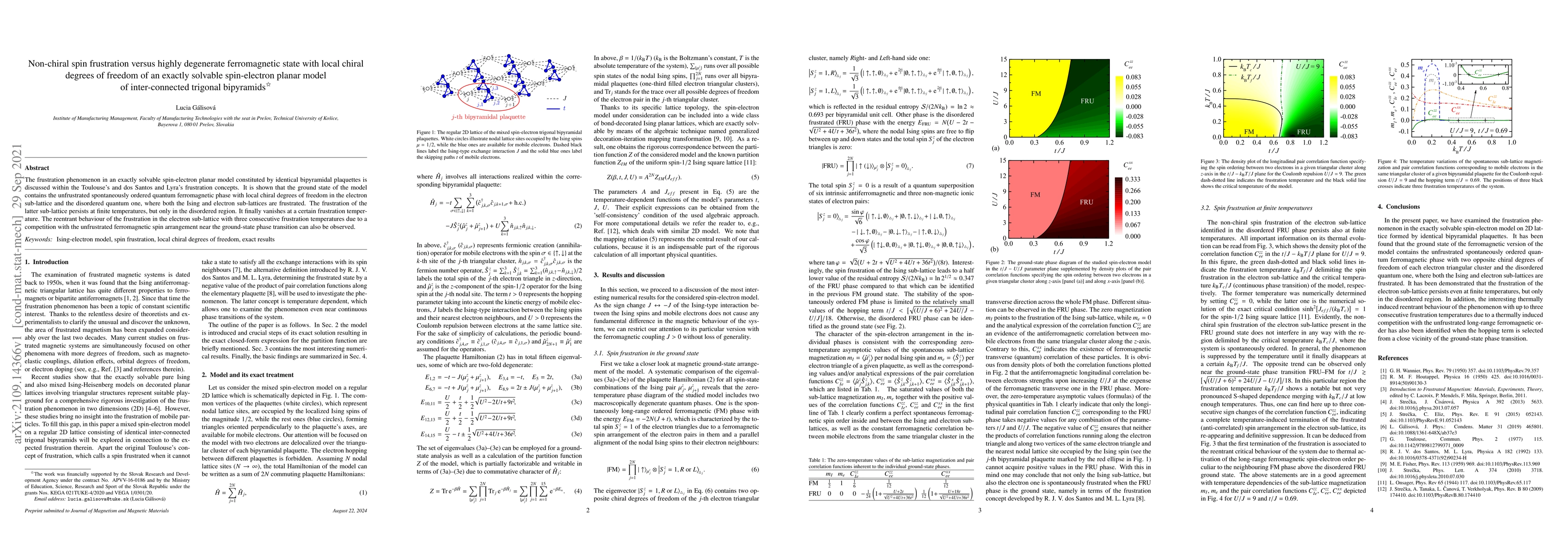 Researchers investigated a spin-electron model of interconnected trigonal bipyramids and found that it exhibits both chiral frustration and ferromagnetic ordering at different temperatures, with the frustration persisting in certain regions.