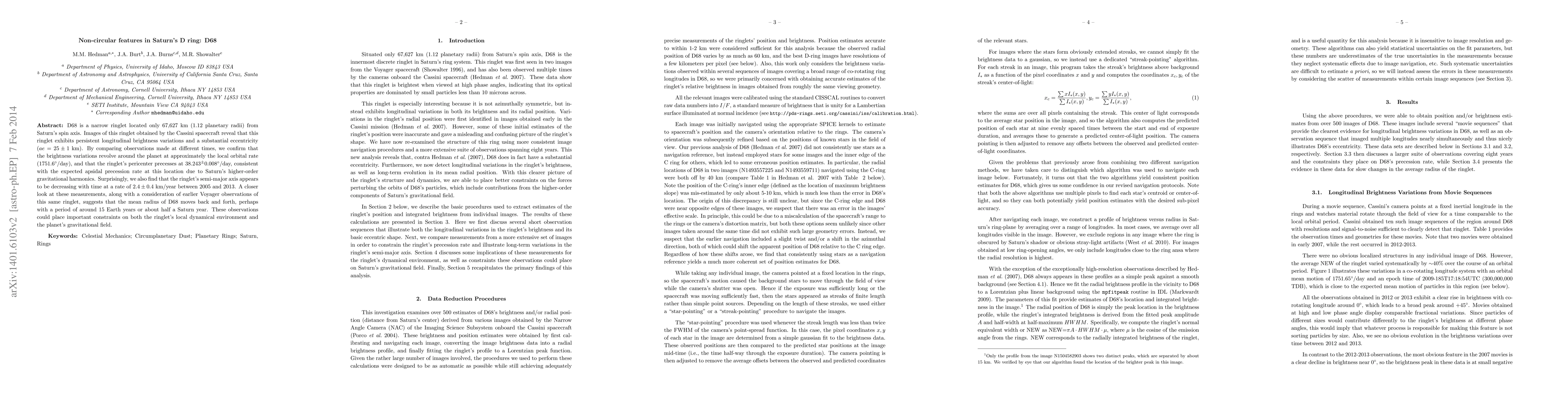 D68 is a narrow ringlet located only 67,627 km (1.12 planetary radii) from Saturn's spin axis. Images of this ringlet obtained by the Cassini spacecraft reveal that this ringlet exhibits persistent longitudinal brightness variations and a substantial eccentricity (ae=25+/-1 km). By comparing observations made at different times, we confirm that the brightness variations revolve around the planet at approximately the local orbital rate (1751.6 degrees/day), and that the ringlet's pericenter precesses at 38.243+/-0.008 degrees/day, consistent with the expected apsidal precession rate at this location due to Saturn's higher-order gravitational harmonics. Surprisingly, we also find that the ringlet's semi-major axis appears to be decreasing with time at a rate of 2.4+/-0.4 km/year between 2005 and 2013. A closer look at these measurements, along with a consideration of earlier Voyager observations of this same ringlet, suggests that the mean radius of D68 moves back and forth, perhaps with a period of around 15 Earth years or about half a Saturn year. These observations could place important constraints on both the ringlet's local dynamical environment and the planet's gravitational field.