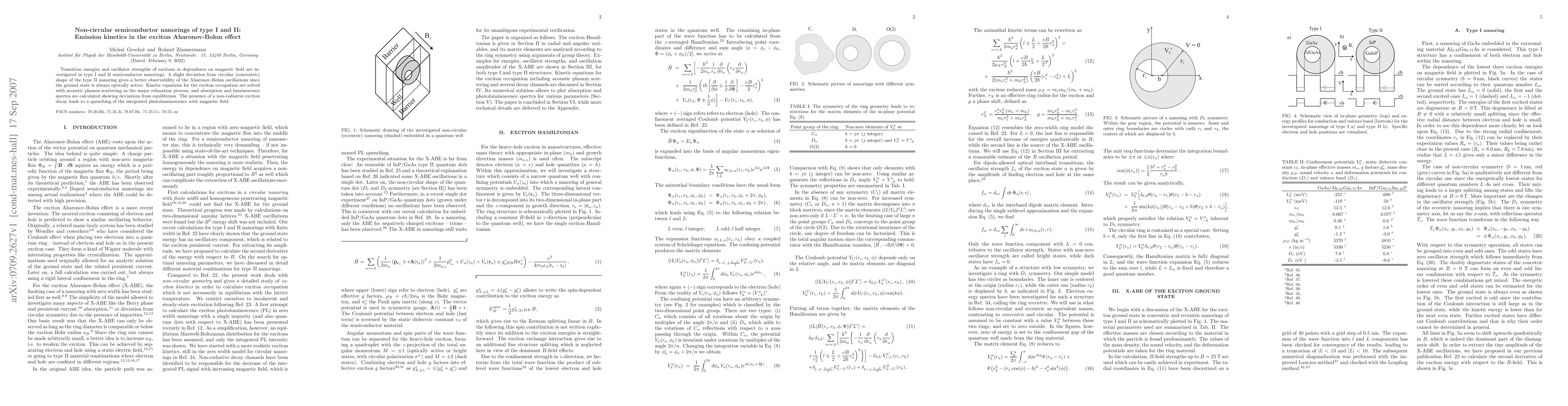 This paper investigates the exciton emission kinetics in non-circular semiconductor nanorings, focusing on the Aharonov-Bohm effect. It finds that slight deviations in shape enhance the observability of the effect in type II nanorings due to constant optical activity in the ground state.