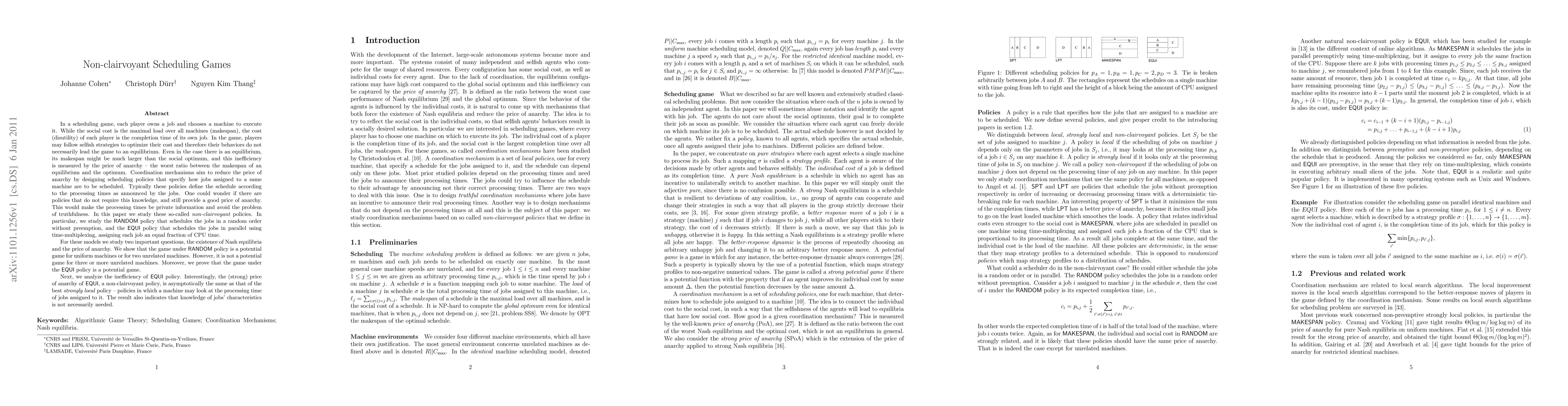 This paper investigates non-clairvoyant scheduling policies in games where players aim to minimize their own job completion times while maximizing the overall makespan. It examines the RANDOM policy (random job scheduling) and the EQUI policy (equal time-multiplexing) to determine their effectiveness in achieving a good price of anarchy without requiring knowledge of job processing times.