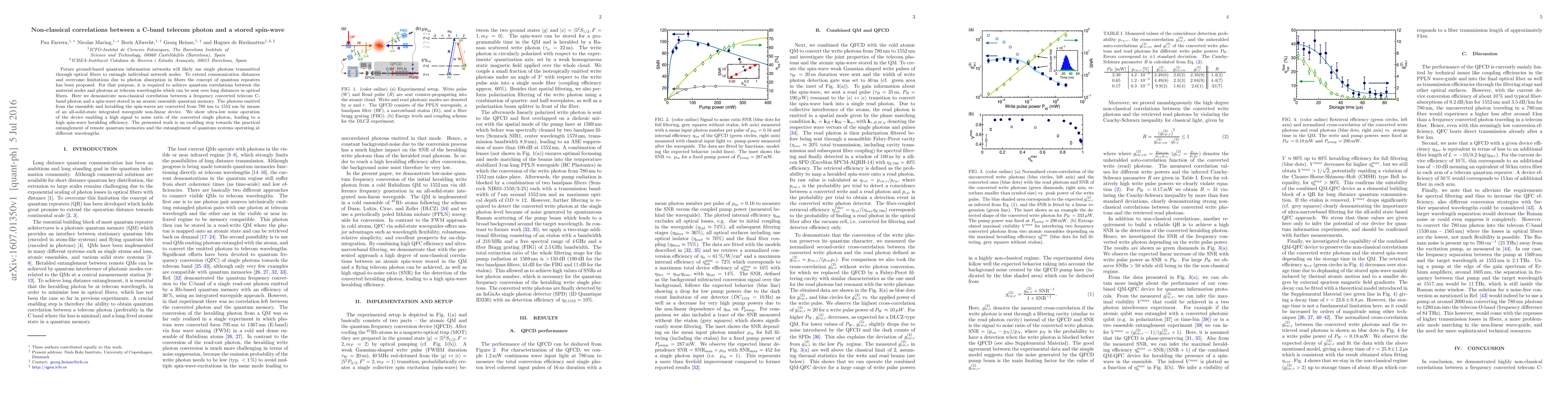This paper demonstrates non-classical correlations between a telecom C-band photon and a spin-wave stored in an atomic ensemble quantum memory, enabling potential long-distance quantum communication via quantum repeaters. The study uses an all-solid-state device to convert photons, achieving high signal-to-noise ratios and heralding efficiency.