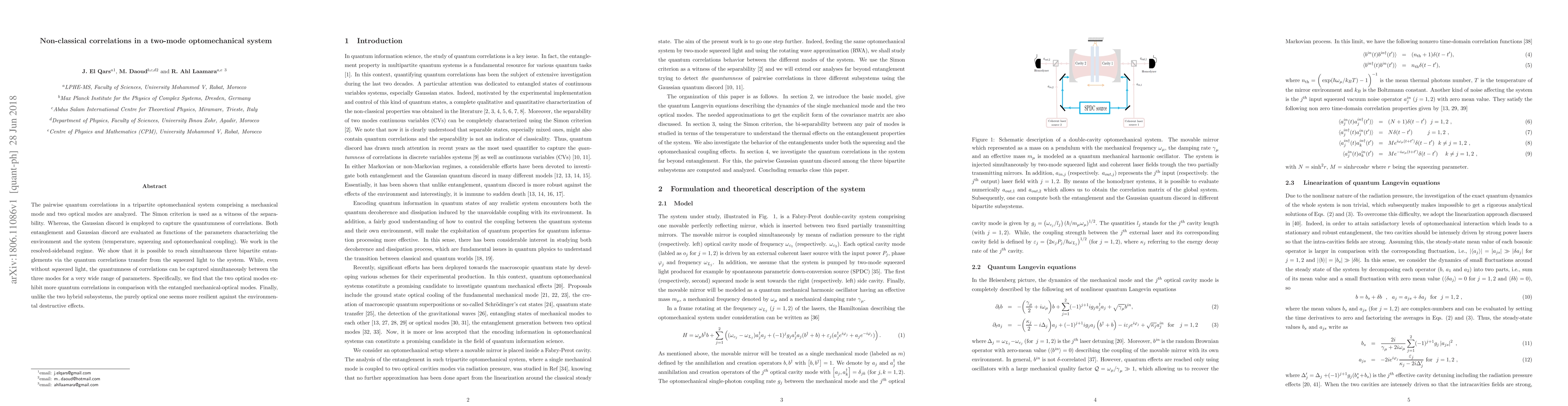 The pairwise quantum correlations in a tripartite optomechanical system comprising a mechanical mode and two optical modes are analyzed. The Simon criterion is used as a witness of the separability. Whereas, the Gaussian discord is employed to capture the quantumness of correlations. Both entanglement and Gaussian discord are evaluated as functions of the parameters characterizing the environment and the system (temperature, squeezing and optomechanical coupling). We work in the resolved-sideband regime. We show that it is possible to reach simultaneous three bipartite entanglements via the quantum correlations transfer from the squeezed light to the system. While, even without squeezed light, the quantumness of correlations can be captured simultaneously between the three modes for a very wide range of parameters. Specifically, we find that the two optical modes exhibit more quantum correlations in comparison with the entangled mechanical-optical modes. Finally, unlike the two hybrid subsystems, the purely optical one seems more resilient against the environmental destructive effects.