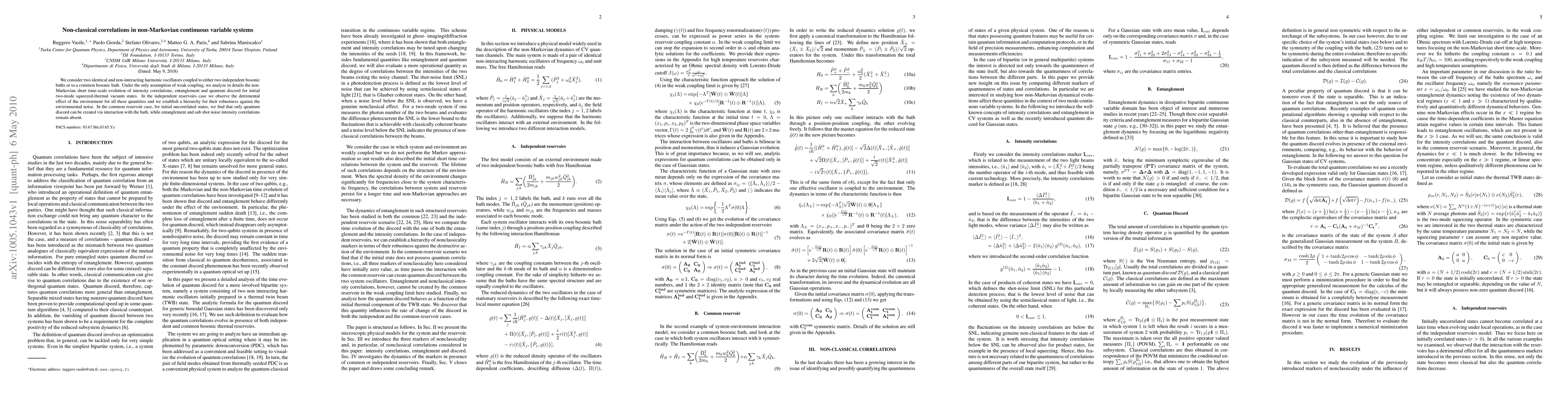 We consider two identical and non-interacting harmonic oscillators coupled to either two independent bosonic baths or to a common bosonic bath. Under the only assumption of weak coupling, we analyze in details the non-Markovian short time-scale evolution of intensity correlations, entanglement and quantum discord for initial two-mode squeezed-thermal vacuum states. In the independent reservoirs case we observe the detrimental effect of the environment for all these quantities and we establish a hierarchy for their robustness against the environmental noise. In the common reservoir case, for initial uncorrelated states, we find that only quantum discord can be created via interaction with the bath, while entanglement and sub shot noise intensity correlations remain absent.