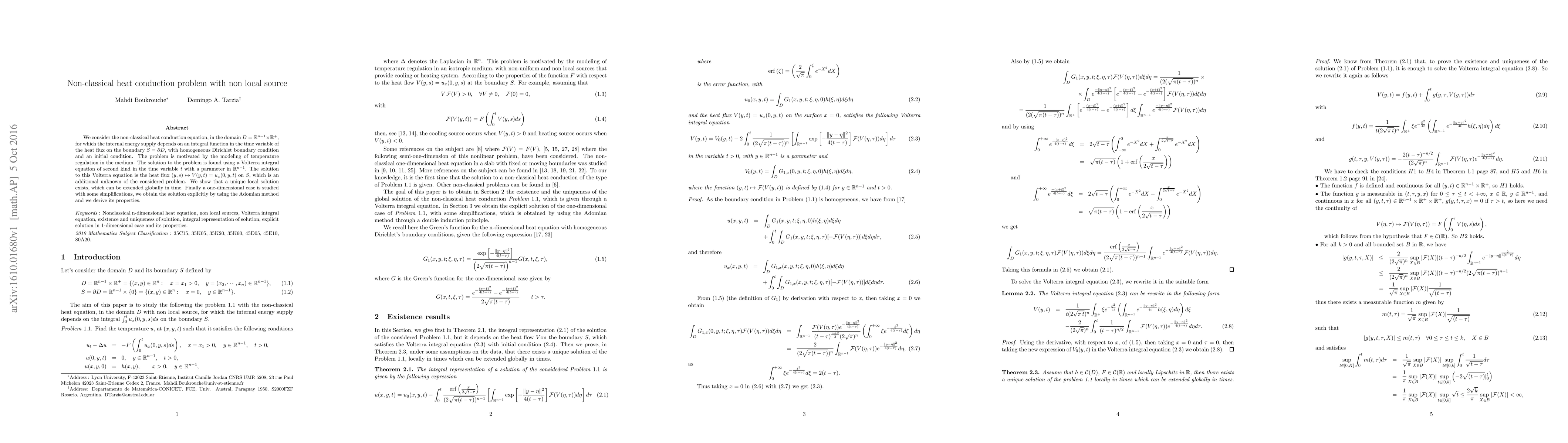 We consider the non-classical heat conduction equation, in the domain $D=\br^{n-1}\times\br^{+}$, for which the internal energy supply depends on an integral function in the time variable of % $(y , t)\mapsto \int_{0}^{t} u_{x}(0 , y , s) ds$, %where $u_{x}(0 , y , s)$ is the heat flux on the boundary $S=\partial D$, with homogeneous Dirichlet boundary condition and an initial condition. The problem is motivated by the modeling of temperature regulation in the medium. The solution to the problem is found using a Volterra integral equation of second kind in the time variable $t$ with a parameter in $\br^{n-1}$. The solution to this Volterra equation is the heat flux $(y, s)\mapsto V(y , t)= u_{x}(0 , y , t)$ on $S$, which is an additional unknown of the considered problem. We show that a unique local solution exists, which can be extended globally in time. Finally a one-dimensional case is studied with some simplifications, we obtain the solution explicitly by using the Adomian method and we derive its properties.