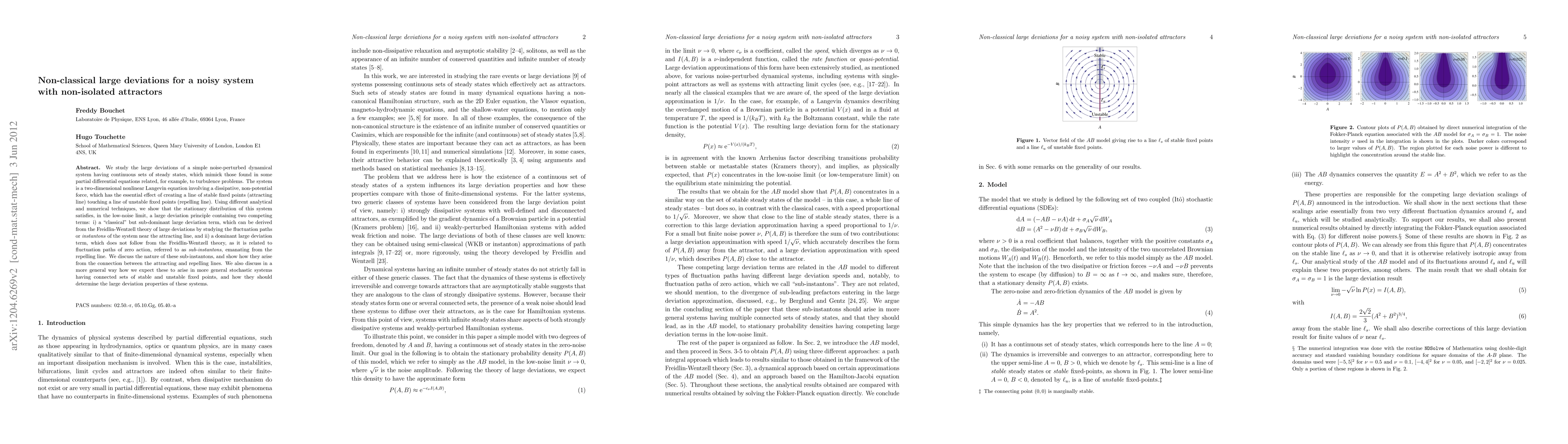 This paper investigates large deviations in a noisy dynamical system with non-isolated attractors, modeled by a two-dimensional nonlinear Langevin equation. It reveals a large deviation principle with two terms: a classical term from fluctuation paths near stable points and a dominant non-classical term from zero-action fluctuation paths near unstable points, termed sub-instantons.