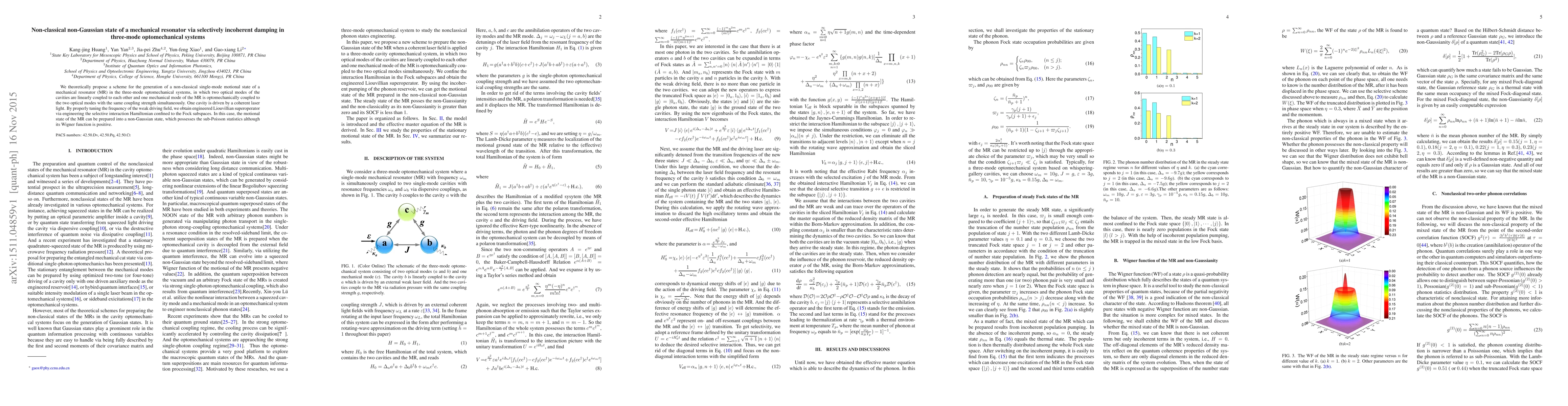 This paper proposes a method to generate a non-classical, non-Gaussian state in a mechanical resonator within a three-mode optomechanical system through selectively incoherent damping. The scheme involves coupling two optical modes and one mechanical mode, with a coherent laser driving one cavity, leading to a sub-Poisson statistics state with a positive Wigner function.