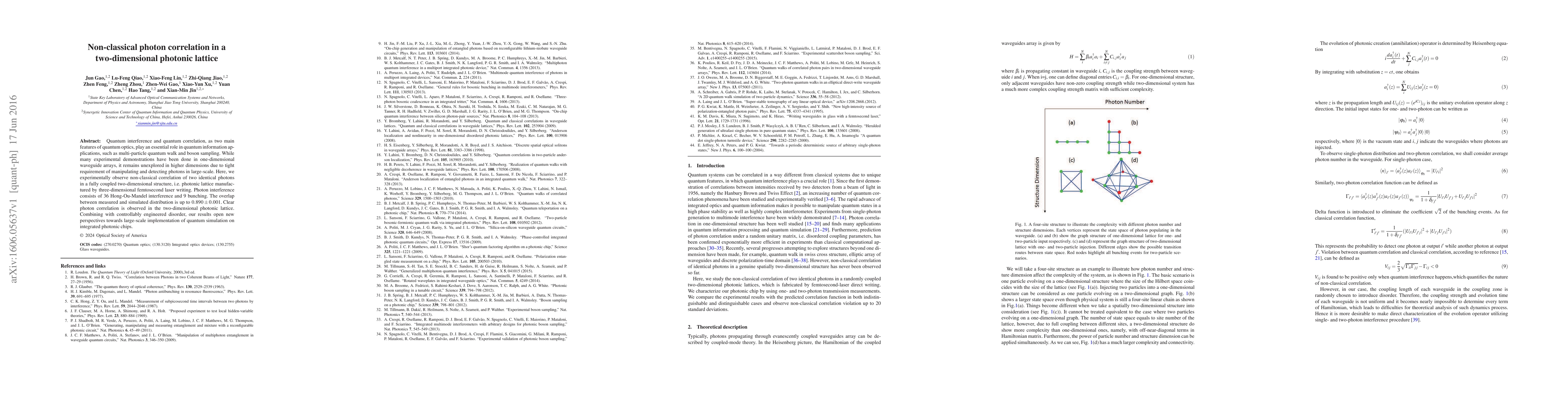 Quantum interference and quantum correlation, as two main features of quantum optics, play an essential role in quantum information applications, such as multi-particle quantum walk and boson sampling. While many experimental demonstrations have been done in one-dimensional waveguide arrays, it remains unexplored in higher dimensions due to tight requirement of manipulating and detecting photons in large-scale. Here, we experimentally observe non-classical correlation of two identical photons in a fully coupled two-dimensional structure, i.e. photonic lattice manufactured by three-dimensional femtosecond laser writing. Photon interference consists of 36 Hong-Ou-Mandel interference and 9 bunching. The overlap between measured and simulated distribution is up to $0.890\pm0.001$. Clear photon correlation is observed in the two-dimensional photonic lattice. Combining with controllably engineered disorder, our results open new perspectives towards large-scale implementation of quantum simulation on integrated photonic chips.