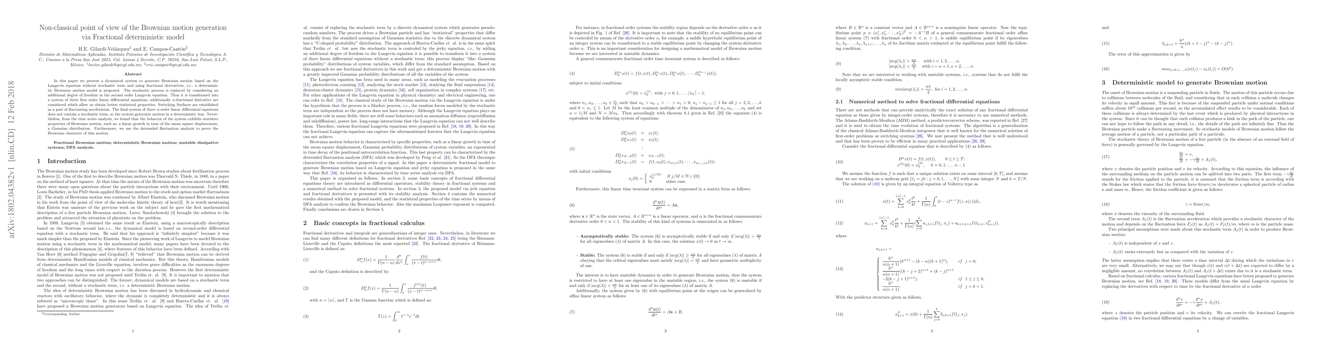 In this paper we present a dynamical system to generate Brownian motion based on the Langevin equation without stochastic term and using fractional derivatives, i.e., a deterministic Brownian motion model is proposed. The stochastic process is replaced by considering an additional degree of freedom in the second order Langevin equation. Thus it is transformed into a system of three first order linear differential equations, additionally $\alpha$-fractional derivative are considered which allow us obtain better statistical properties. Switching Surfaces are established as a part of fluctuating acceleration. The final system of three $\alpha$-order linear differential equations does not contain a stochastic term, so the system generates motion in a deterministic way. Nevertheless, from the time series analysis, we found that the behavior of the system exhibits statistics properties of Brownian motion, such as, a linear growth in time of the mean square displacement, a Gaussian distribution. Furthermore, we use the detrended fluctuation analysis to prove the Brownian character of this motion.