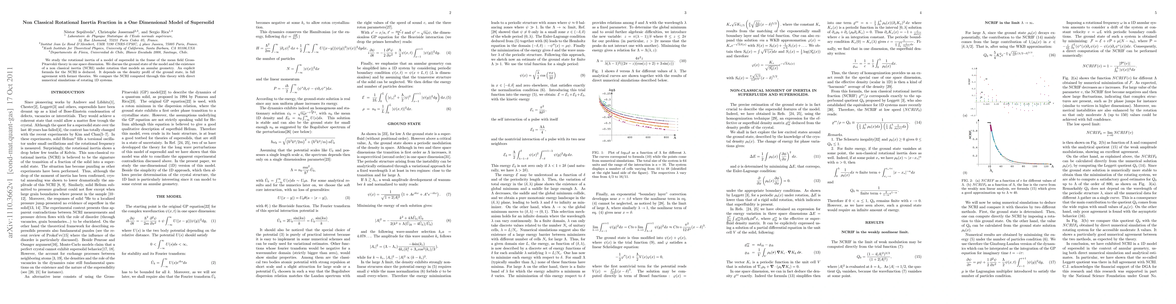 We study the rotational inertia of a model of supersolid in the frame of the mean field Gross-Pitaevskii theory in one space dimension. We discuss the ground state of the model and the existence of a non classical inertia (NCRI) under rotation that models an annular geometry. An explicit formula for the NCRI is deduced. It depends on the density profil of the ground state, in full agreement with former theories. We compare the NCRI computed through this theory with direct numerical simulations of rotating 1D systems.
