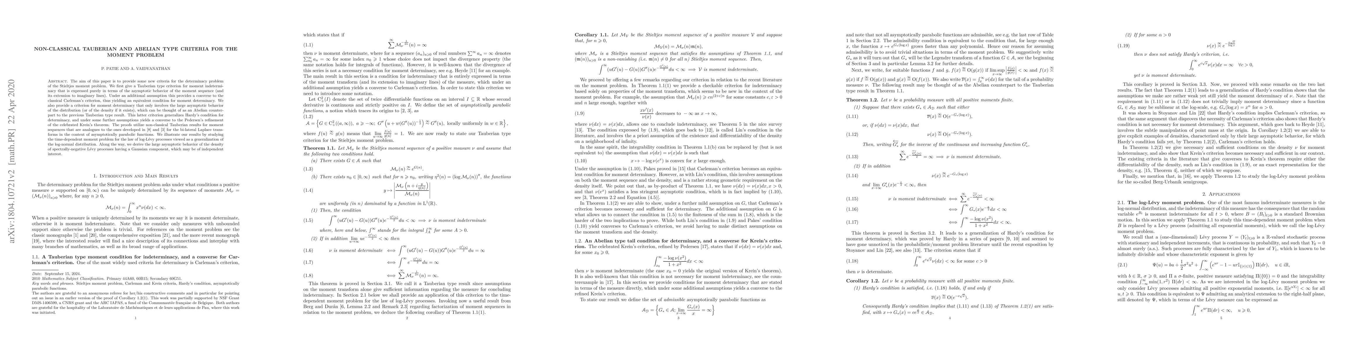 The aim of this paper is to provide some new criteria for the Stieltjes moment problem. We first give a Tauberian type criterion for moment indeterminacy that is expressed purely in terms of the asymptotic behavior of the moment sequence (and its extension to imaginary lines). Under an additional assumption this provides a converse to the classical Carleman's criterion, thus yielding an equivalent condition for moment determinacy. We also provide a criterion for moment determinacy that only involves the large asymptotic behavior of the distribution (or of the density if it exists), which can be thought of as an Abelian counterpart to the previous Tauberian type result. This latter criterion generalizes Hardy's condition for determinacy, and under some further assumptions yields a converse to the Pedersen's refinement of the celebrated Krein's theorem. The proofs utilize non-classical Tauberian results for moment sequences that are analogues to the ones developed in Feigin and Yashchin, and, Balkema et al. for the bi-lateral Laplace transforms in the context of asymptotically parabolic functions. We illustrate our results by studying the time-dependent moment problem for the law of log-L\'evy processes viewed as a generalization of the log-normal distribution. Along the way, we derive the large asymptotic behavior of the density of spectrally-negative L\'evy processes having a Gaussian component, which may be of independent interest.