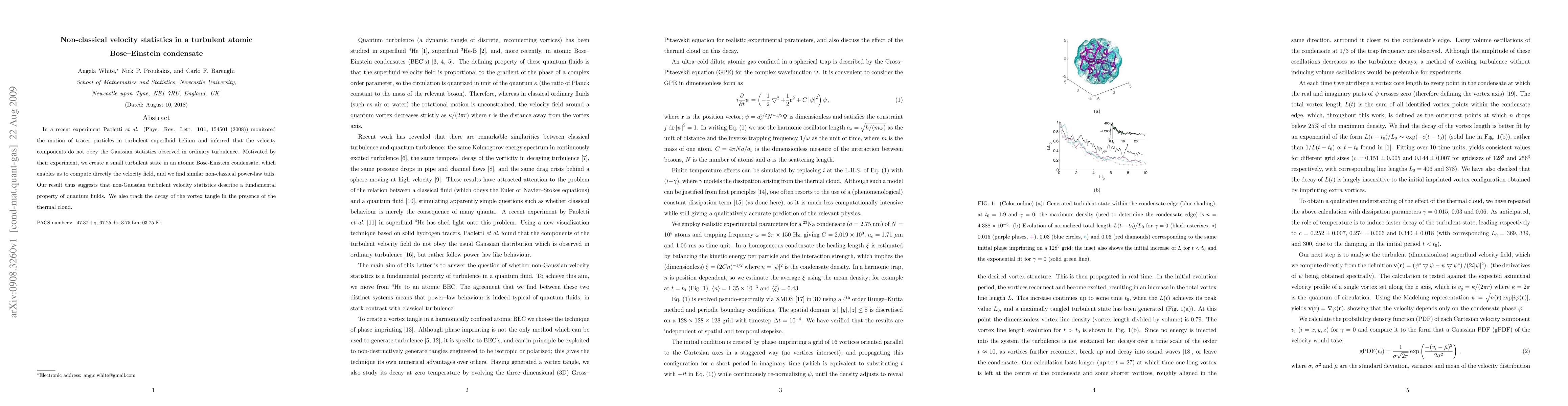 In a recent experiment Paoletti et al (Phys. Rev. Lett. 101, 154501, 2008) monitored the motion of tracer particles in turbulent superfluid helium and inferred that the velocity components do not obey the Gaussian statistics observed in ordinary turbulence. Motivated by their experiment, we create a small turbulent state in an atomic Bose-Einstein condensate, which enables us to compute directly the velocity field, and we find similar non-classical power-law tails. Our result thus suggests that non-Gaussian turbulent velocity statistics describe a fundamental property of quantum fluids. We also track the decay of the vortex tangle in the presence of the thermal cloud.
