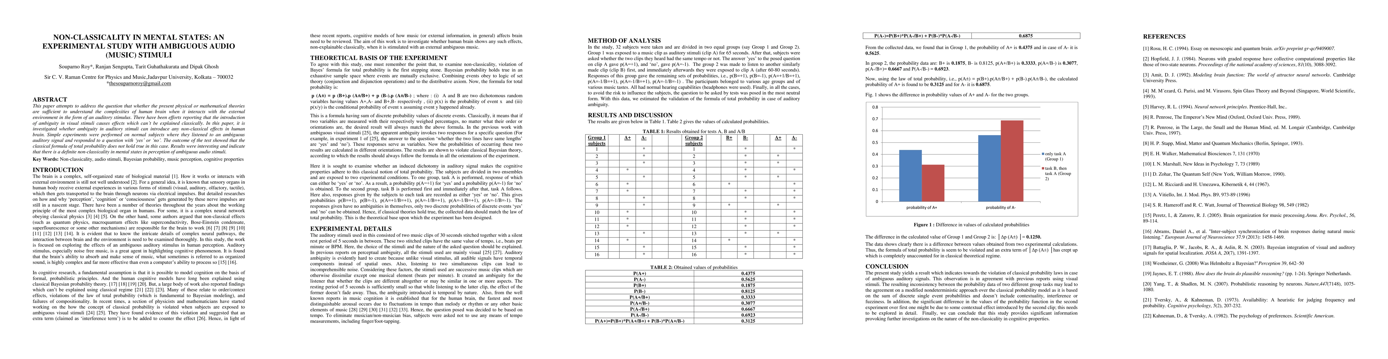 This paper attempts to address the question that whether the present physical or mathematical theories are sufficient to understand the complexities of human brain when it interacts with the external environment in the form of an auditory stimulus.There have been efforts reporting that the introduction of ambiguity in visual stimuli causes effects which can't be explained classically.In this paper,it is investigated whether ambiguity in auditory stimuli can introduce any non-classical effects in human brain.Simple experiments were performed on normal subjects where they listened to an ambiguous auditory signal and responded to a question with 'yes' or 'no'.The outcome of the test showed that the classical formula of total probability does not hold true in this case.Results were interesting and indicate that there is a definite non-classicality in mental states in perception of ambiguous audio stimuli.