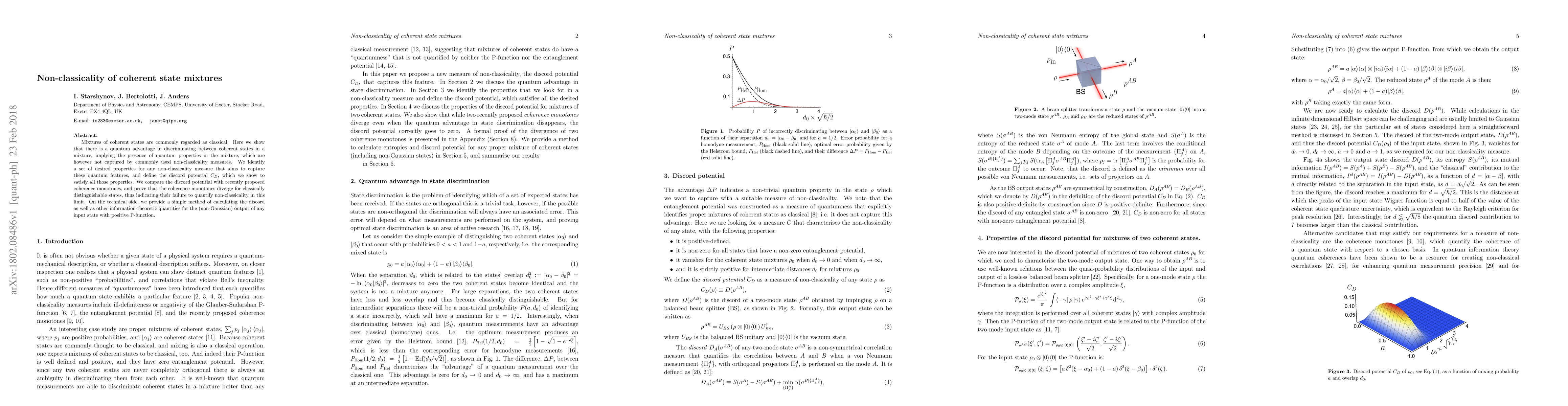 This paper demonstrates a quantum advantage in discriminating between coherent state mixtures, revealing non-classical properties not captured by conventional measures. It introduces the discord potential CD, which better captures these quantum features and outperforms coherence monotones in quantifying non-classicality.
