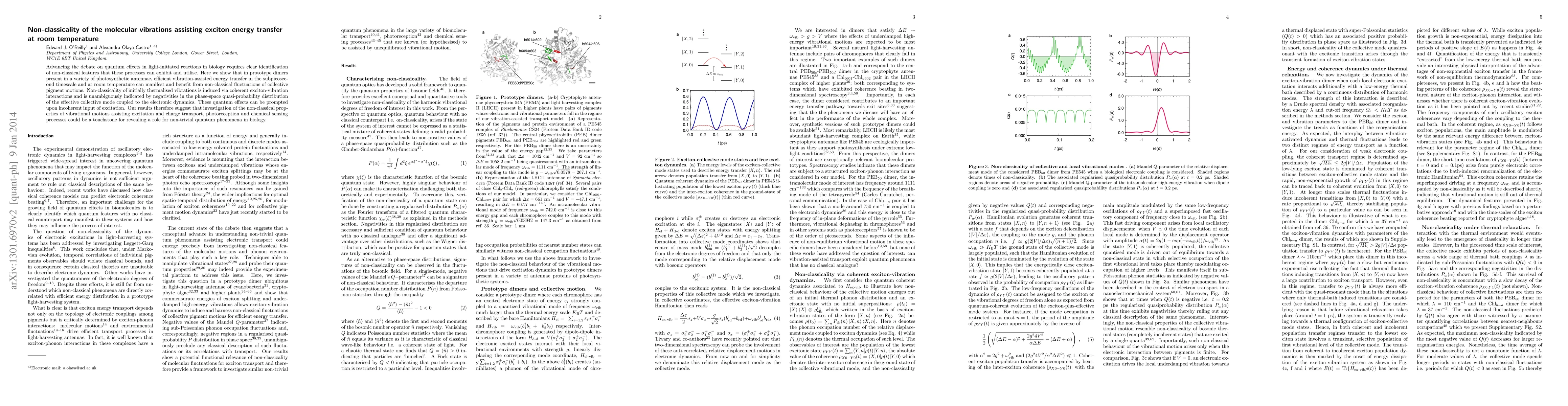 This paper demonstrates that quantum effects, specifically non-classicality in molecular vibrations, enhance exciton energy transfer in photosynthetic complexes at room temperature. Non-classicality is induced through coherent exciton-vibration interactions and indicated by phase-space quasi-probability distribution negativities, suggesting a potential role for quantum phenomena in biological processes.