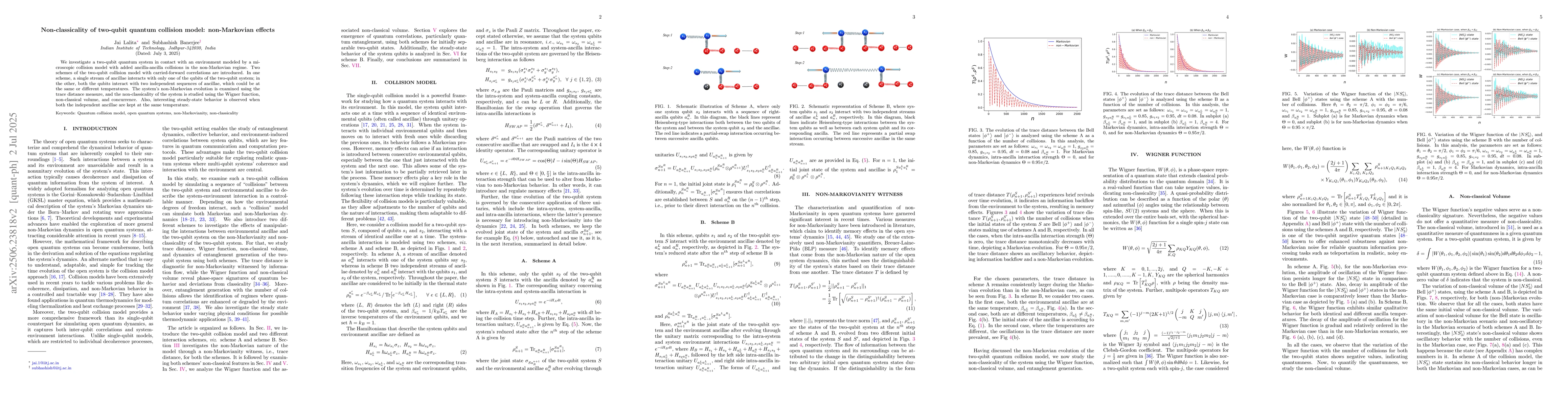 We investigate a two-qubit quantum system in contact with an environment modeled by a microscopic collision model with added ancilla-ancilla collisions in the non-Markovian regime. Two schemes of the two-qubit collision model with carried-forward correlations are introduced. In one scheme, a single stream of ancillae interacts with only one of the qubits of the two-qubit system; in the other, both the qubits interact with two independent sequences of ancillae, which could be at the same or different temperatures. The system's non-Markovian evolution is examined using the trace distance measure, and the non-classicality of the system is studied using the Wigner function, non-classical volume, and concurrence. Also, interesting steady-state behavior is observed when both the independent ancillae are kept at the same temperature.